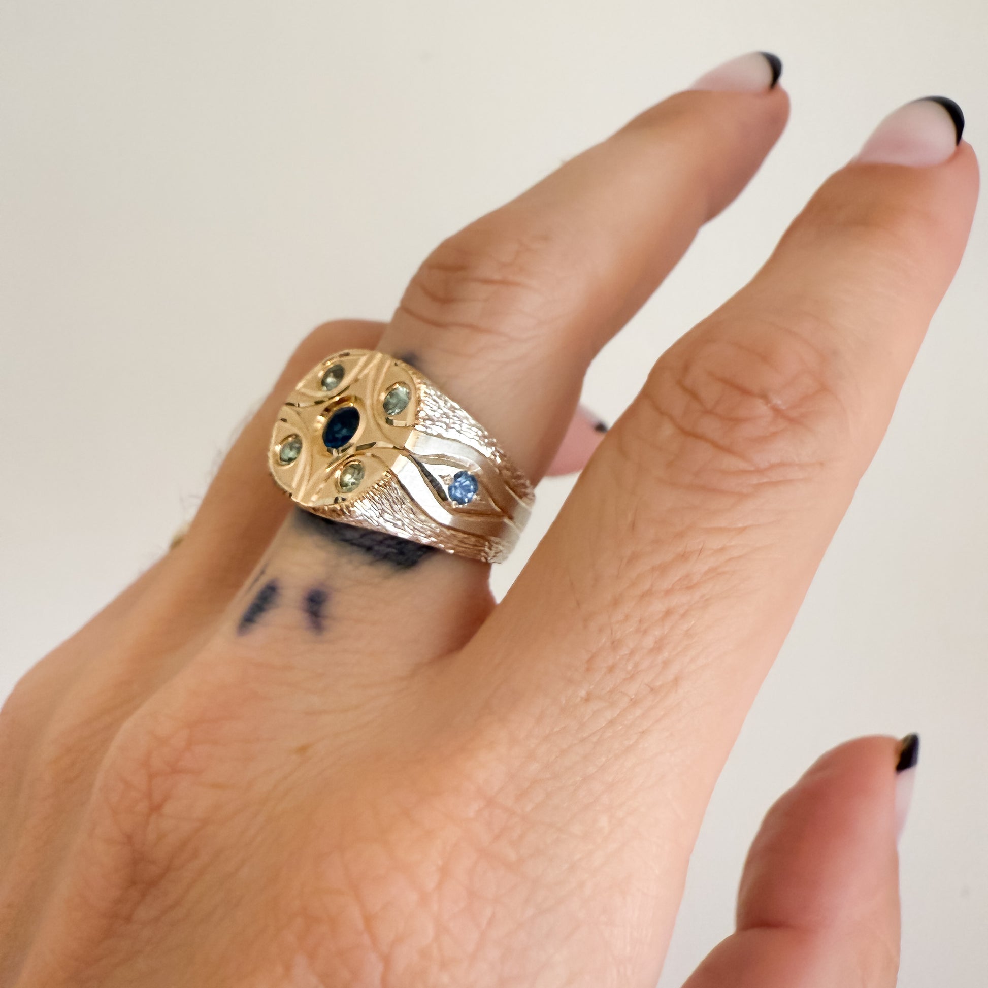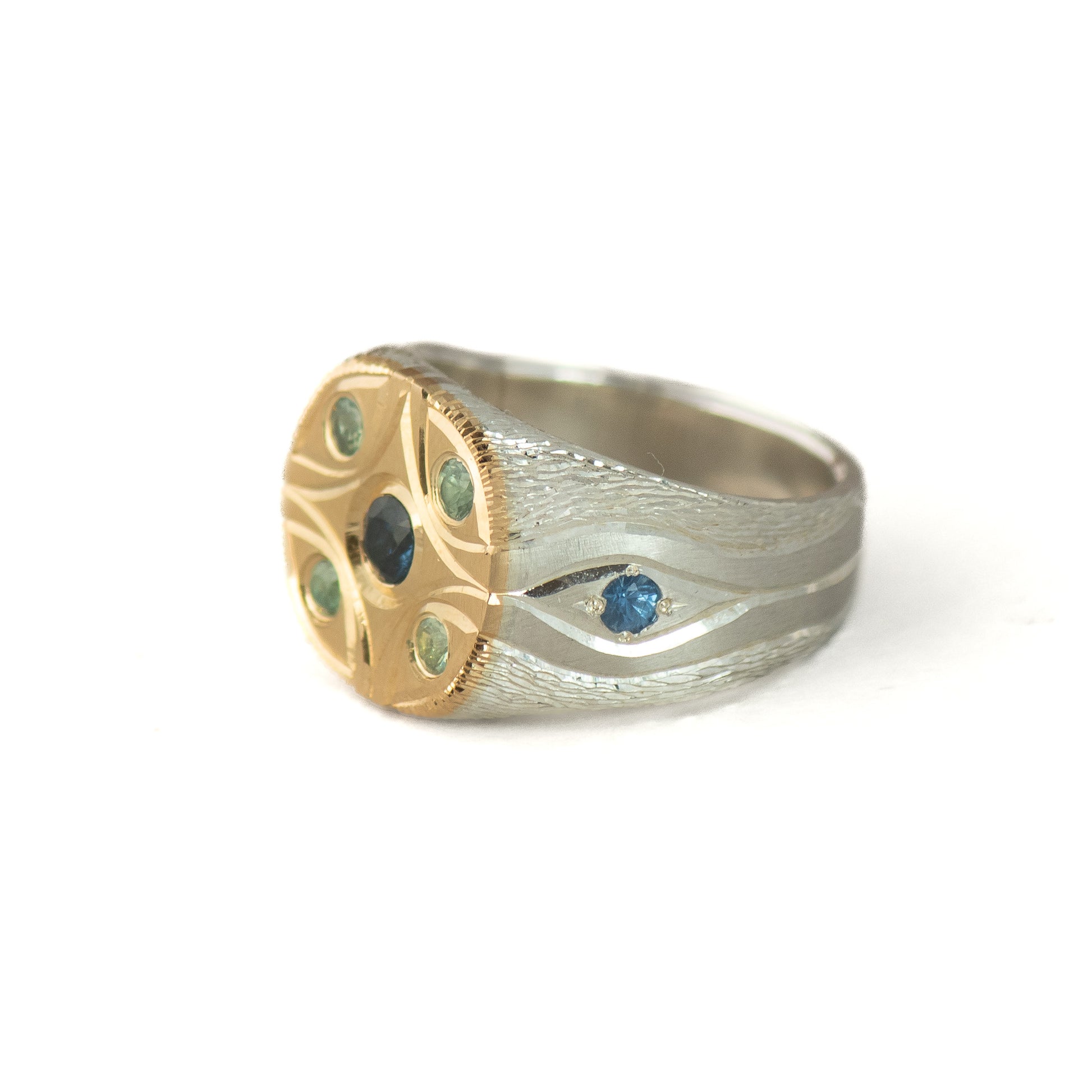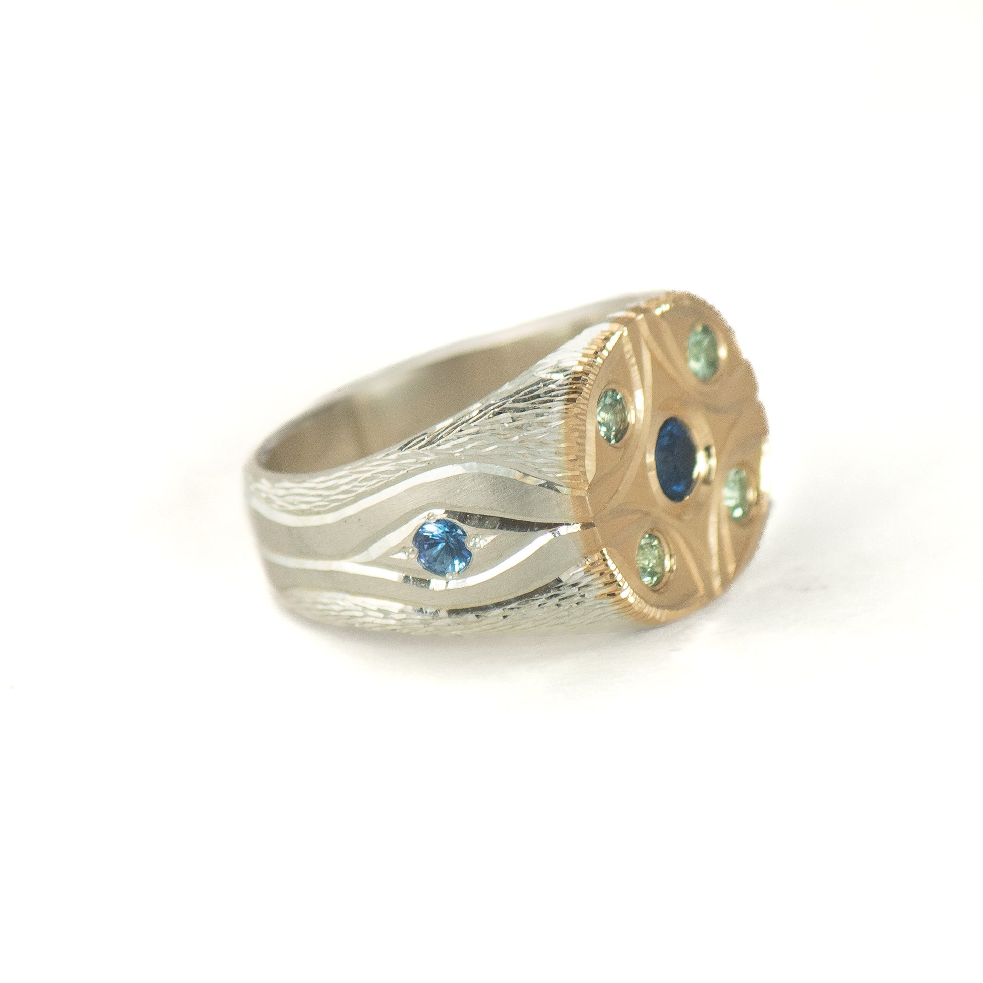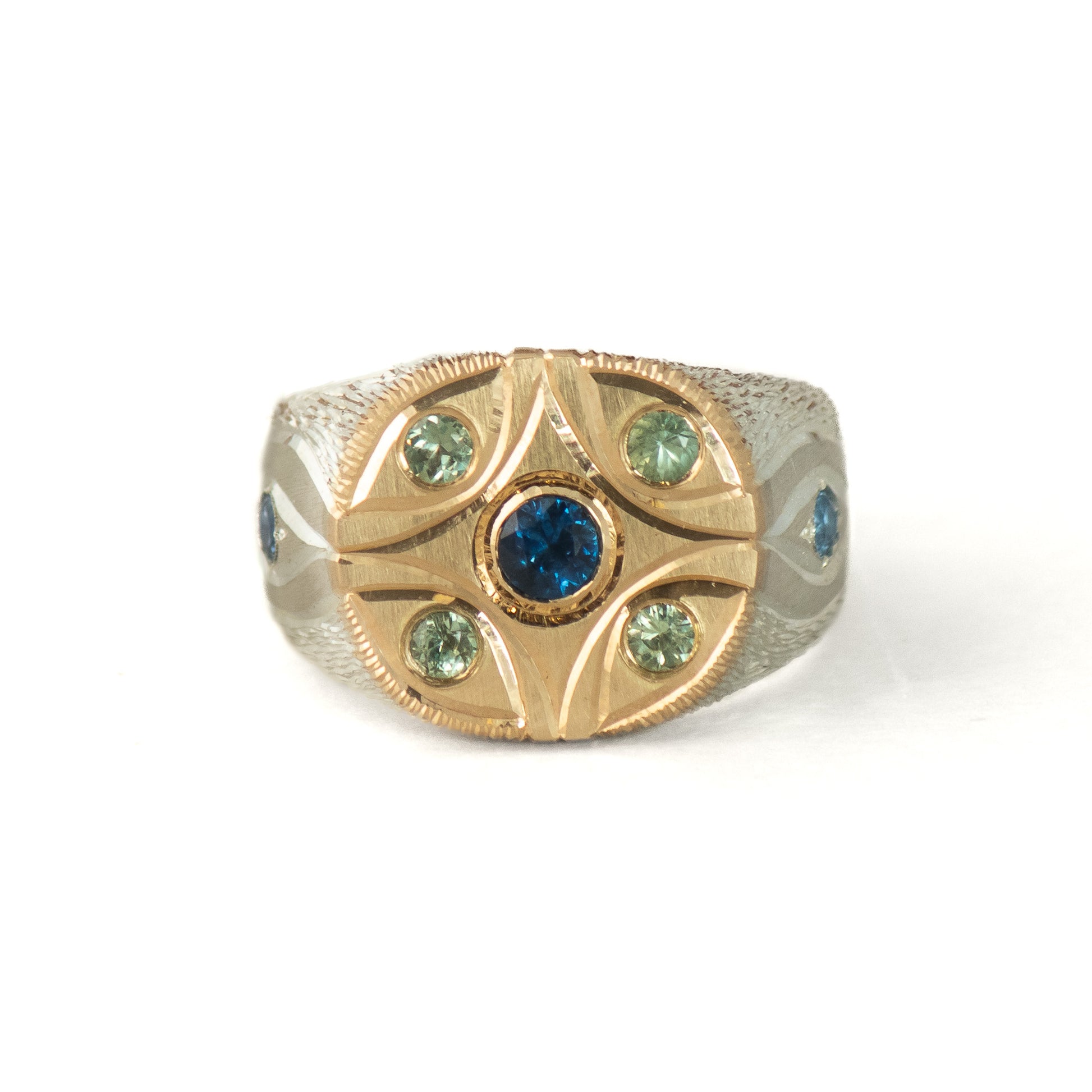 Crafted with a sterling silver base topped with 14k gold plate, this exclusive piece features green and blue sapphires. Its intricate ornamental lines uniquely accentuate the stone placements, creating a distinctive and refined dance between lines, shapes, textures and colors, with a brush finish giving the bright cuts even more shine. As a unique creation, this "ONE of ONE" item is produced only once, ensuring no replicas will ever be made.