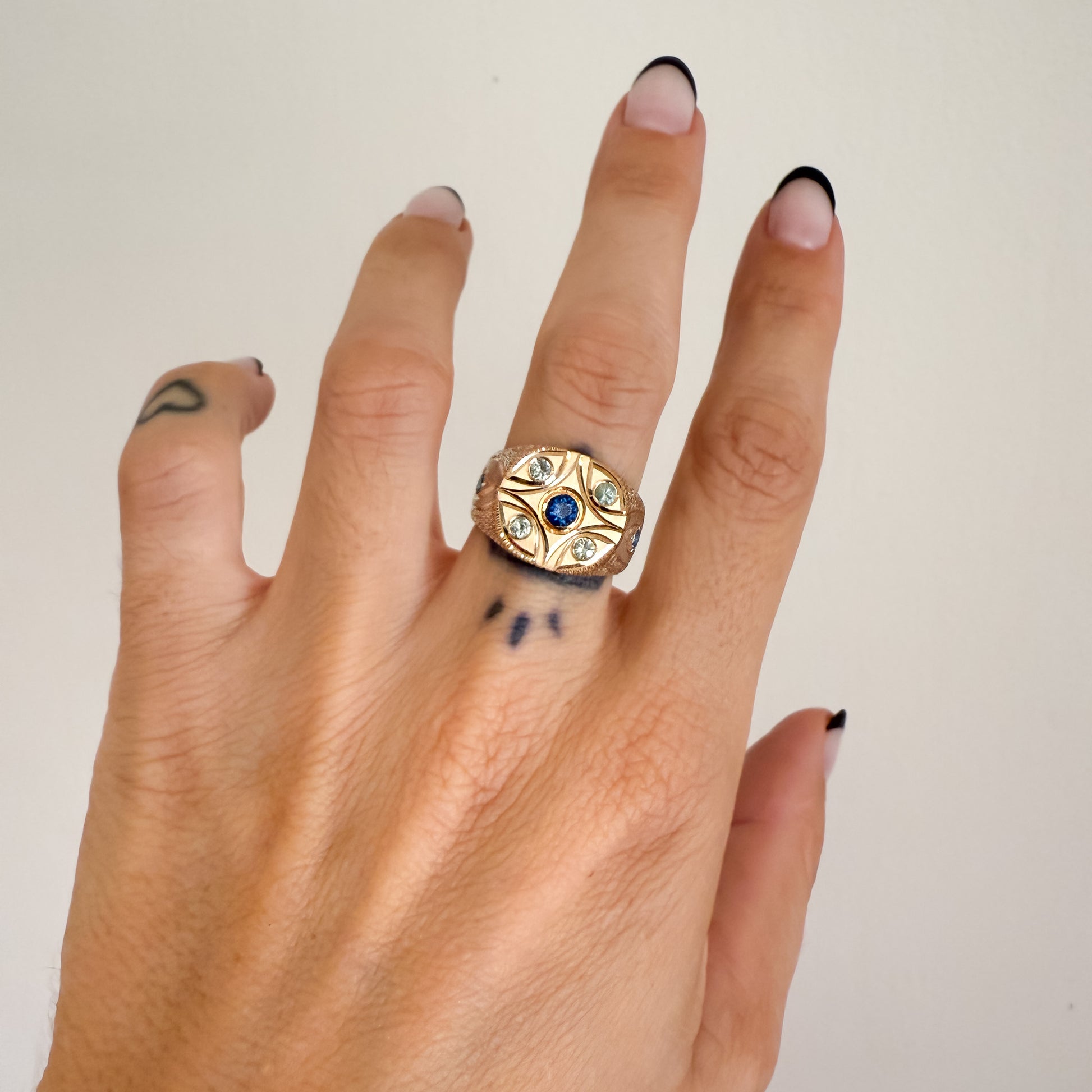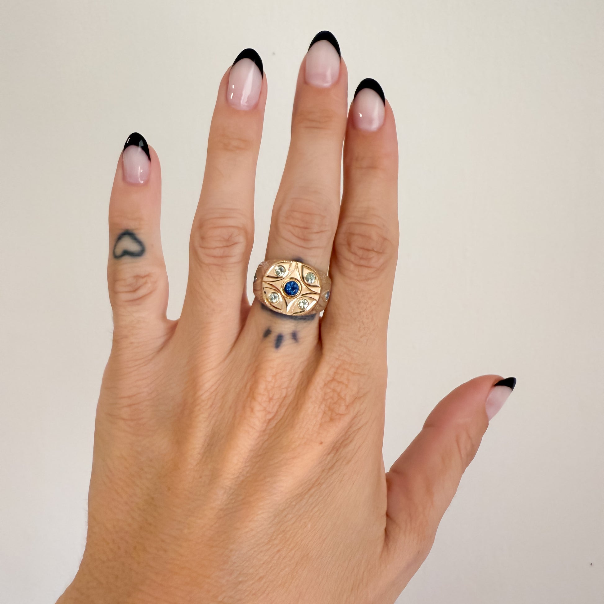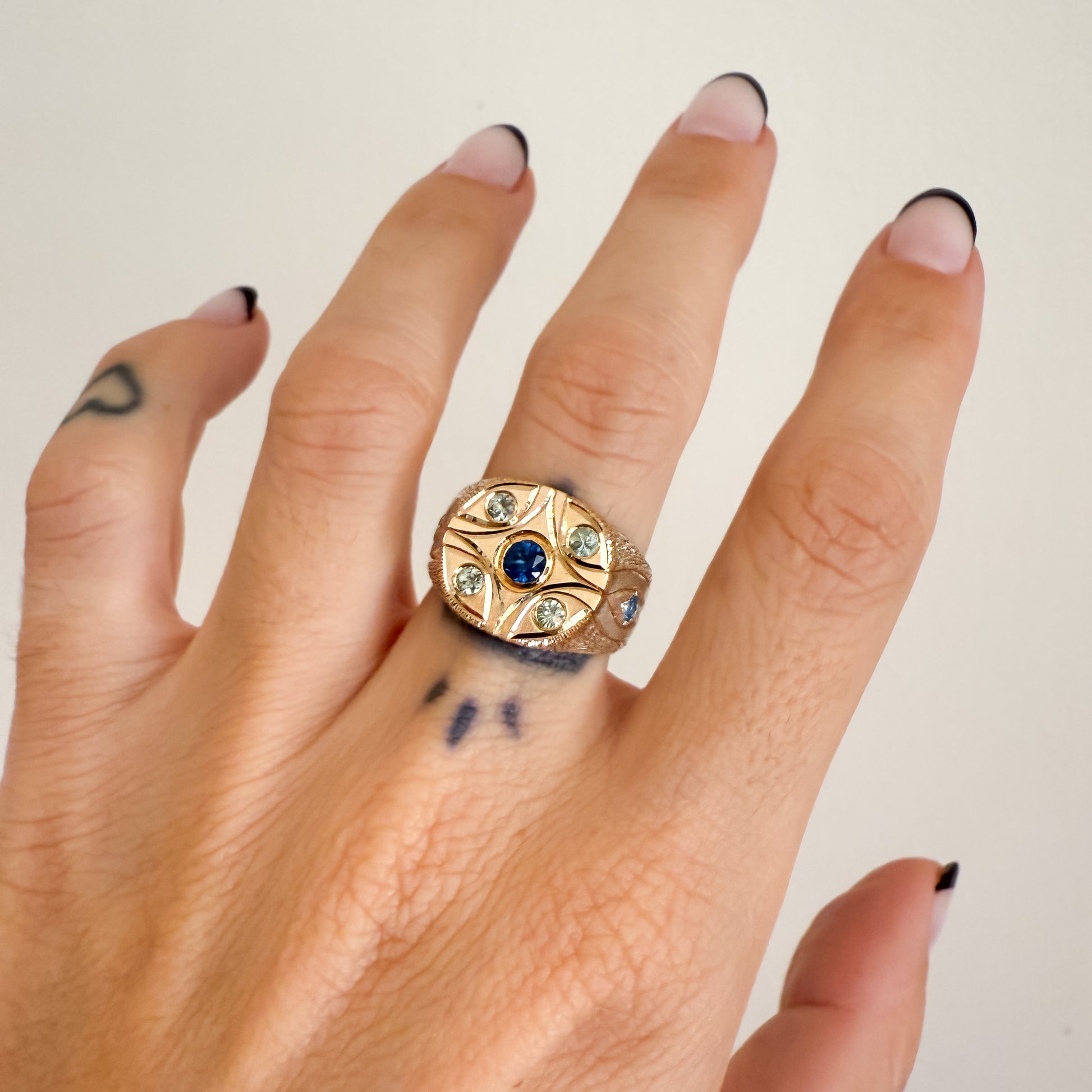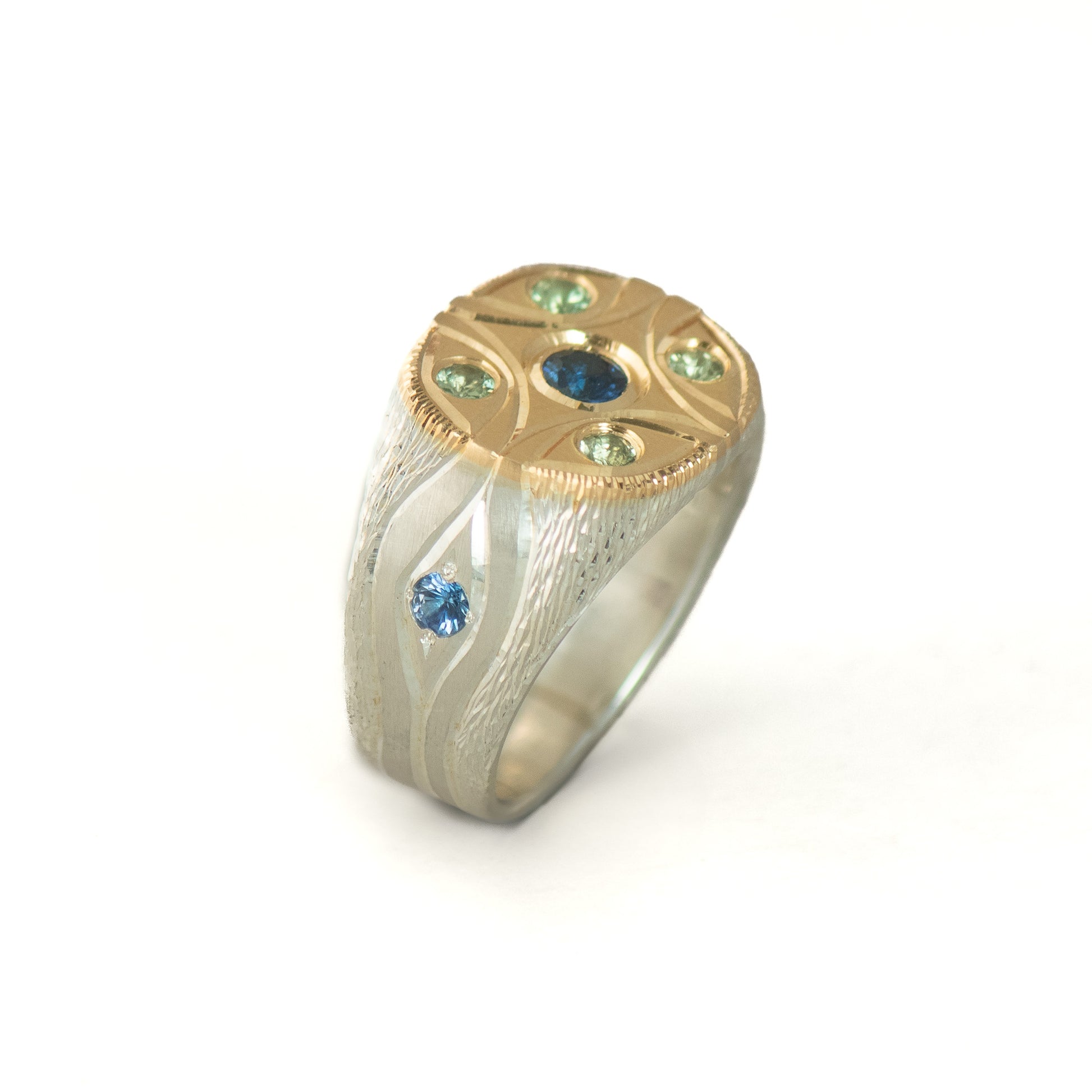 Crafted with a sterling silver base topped with 14k gold plate, this exclusive piece features green and blue sapphires. Its intricate ornamental lines uniquely accentuate the stone placements, creating a distinctive and refined dance between lines, shapes, textures and colors, with a brush finish giving the bright cuts even more shine. As a unique creation, this "ONE of ONE" item is produced only once, ensuring no replicas will ever be made.