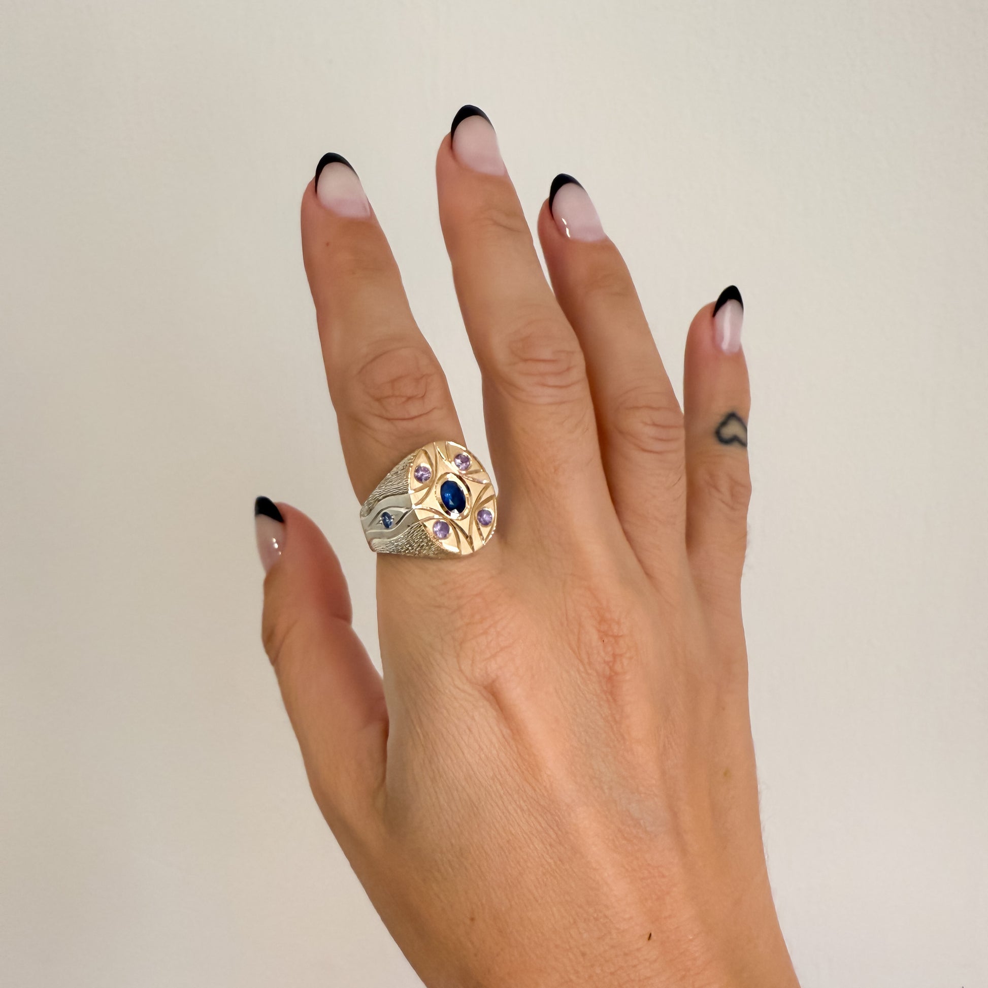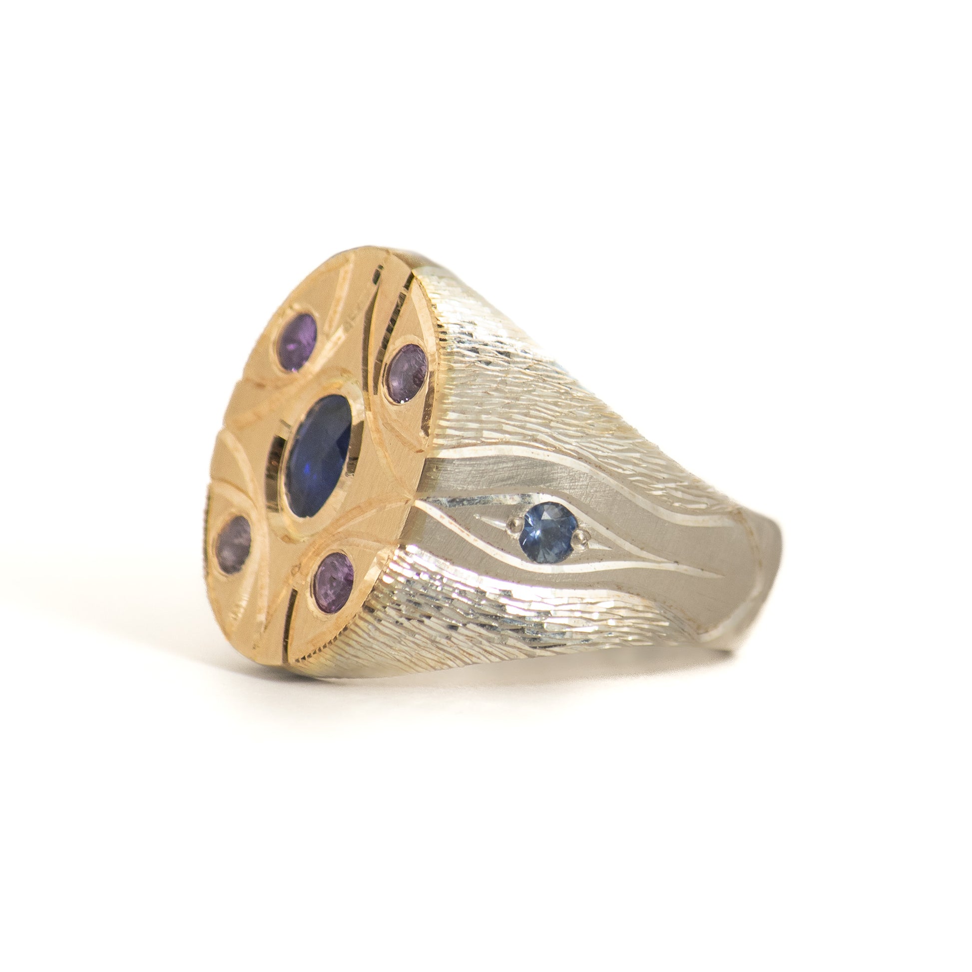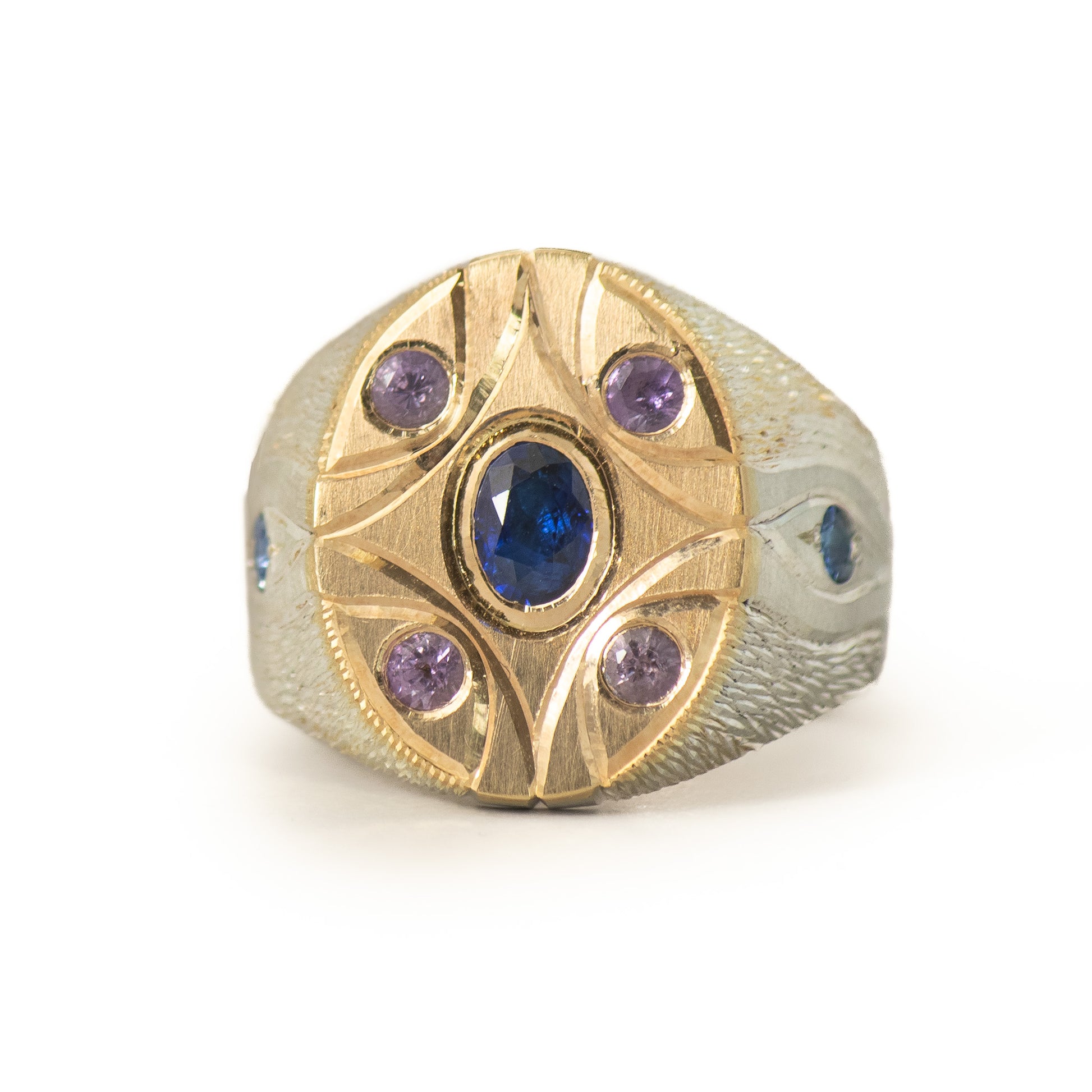 Crafted with a sterling silver base topped with 14k gold plate, this exclusive piece features blue and purple sapphires. Its intricate ornamental lines uniquely accentuate the stone placements, creating a distinctive and refined dance between lines, shapes and colors. As a unique creation, this "ONE of ONE" item is produced only once, ensuring no replicas will ever be made.