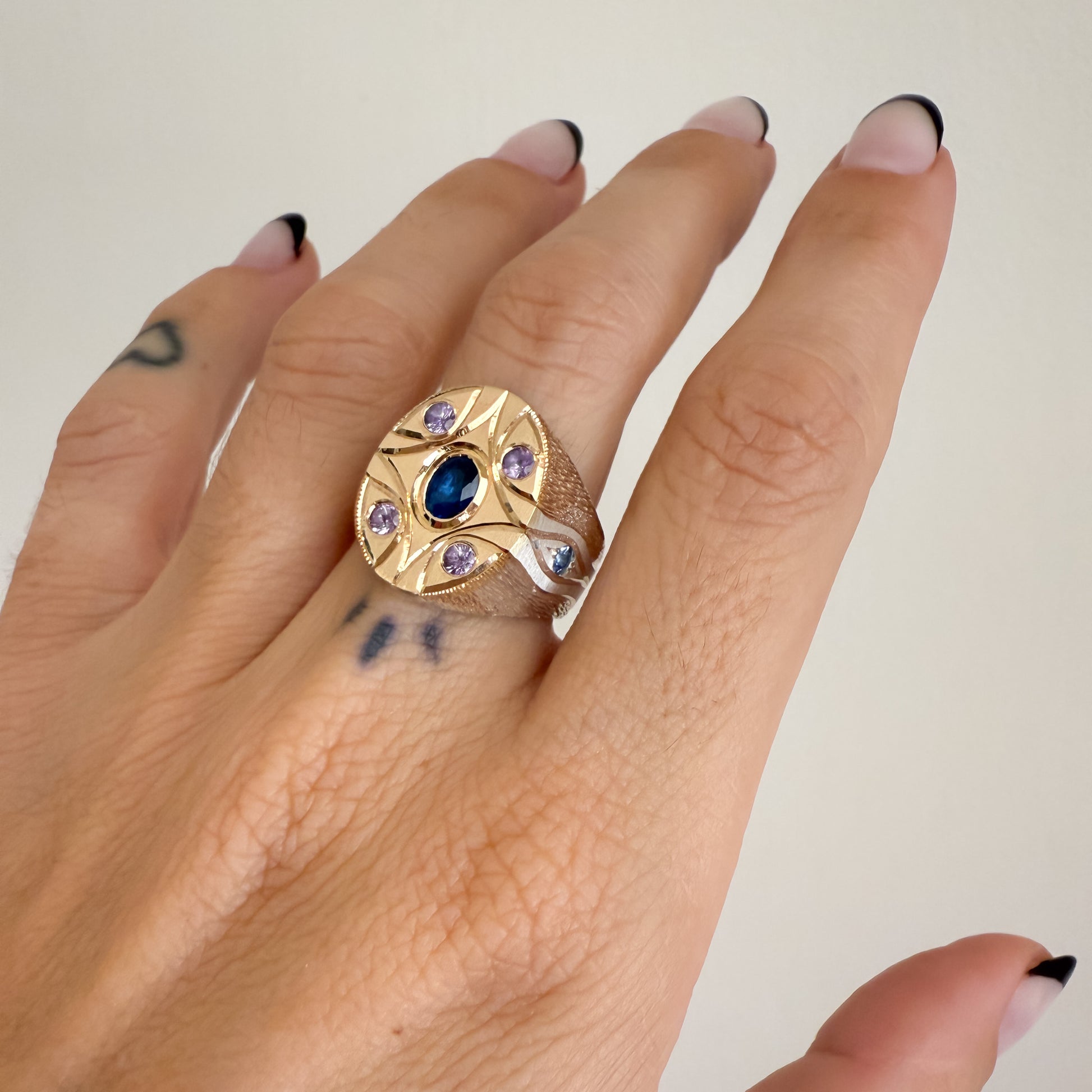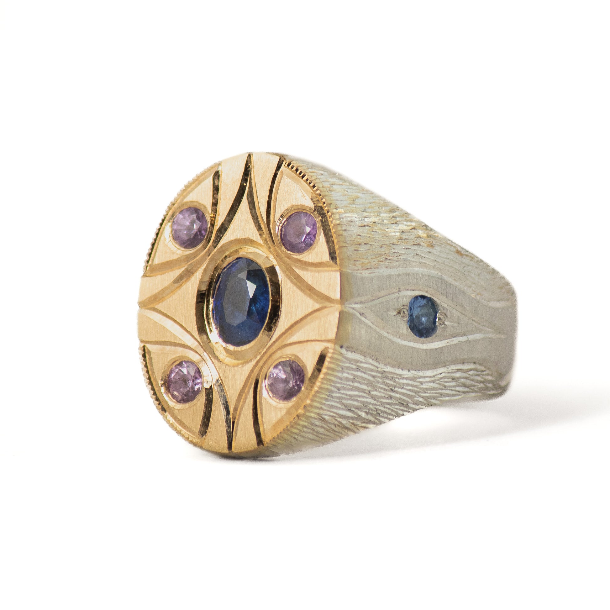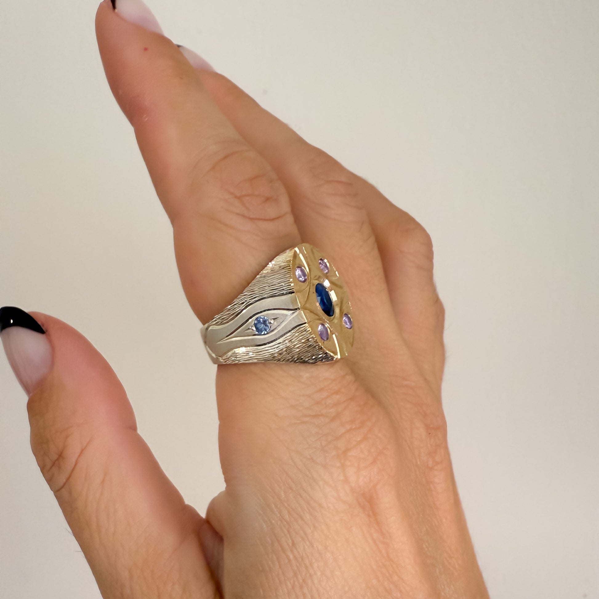 Crafted with a sterling silver base topped with 14k gold plate, this exclusive piece features blue and purple sapphires. Its intricate ornamental lines uniquely accentuate the stone placements, creating a distinctive and refined dance between lines, shapes and colors. As a unique creation, this "ONE of ONE" item is produced only once, ensuring no replicas will ever be made.