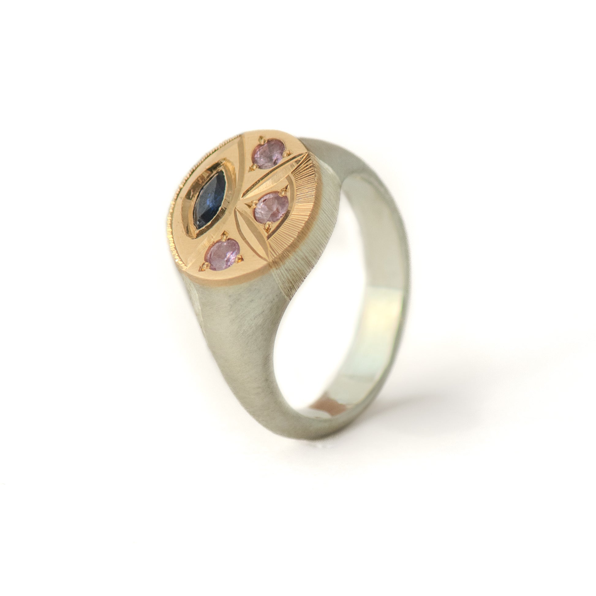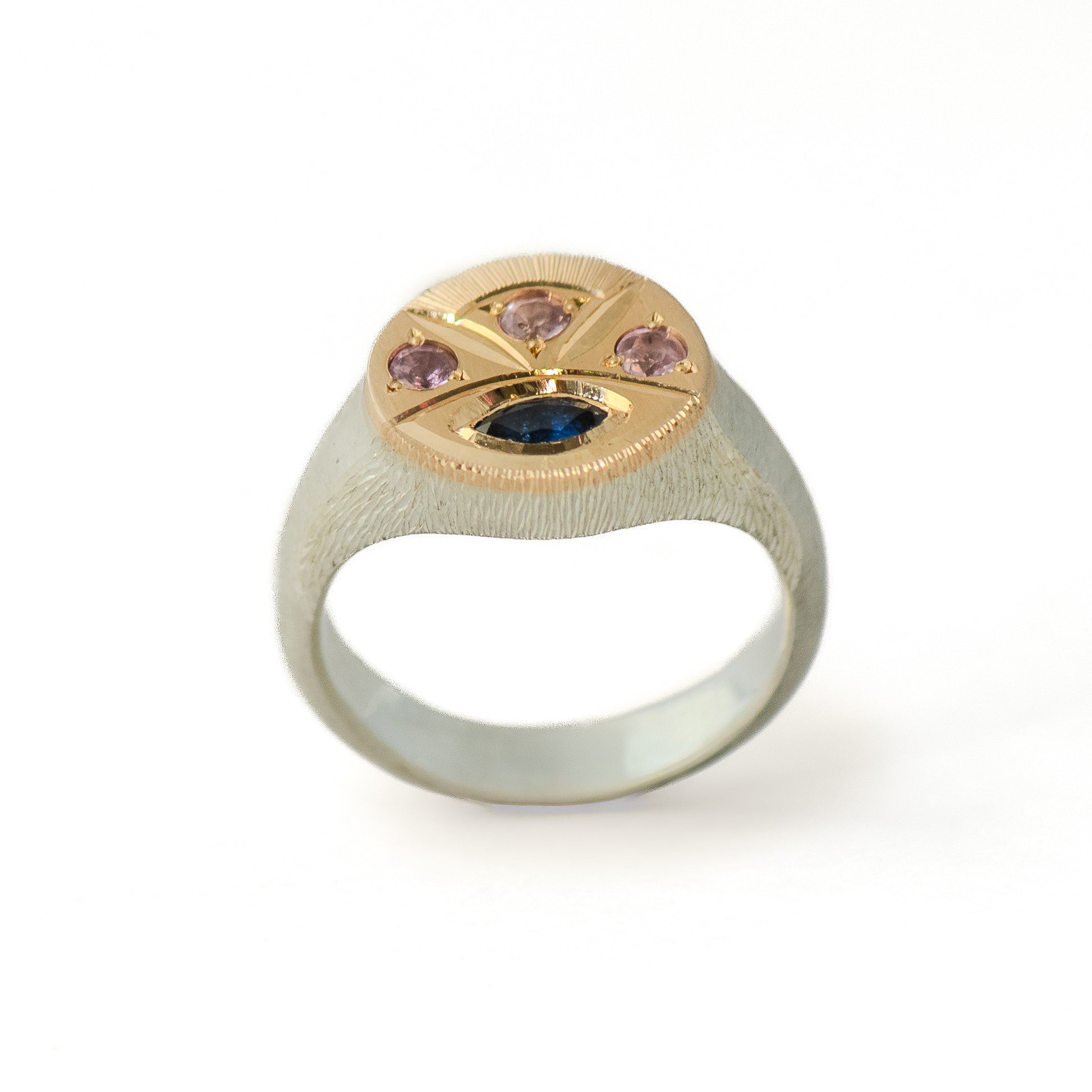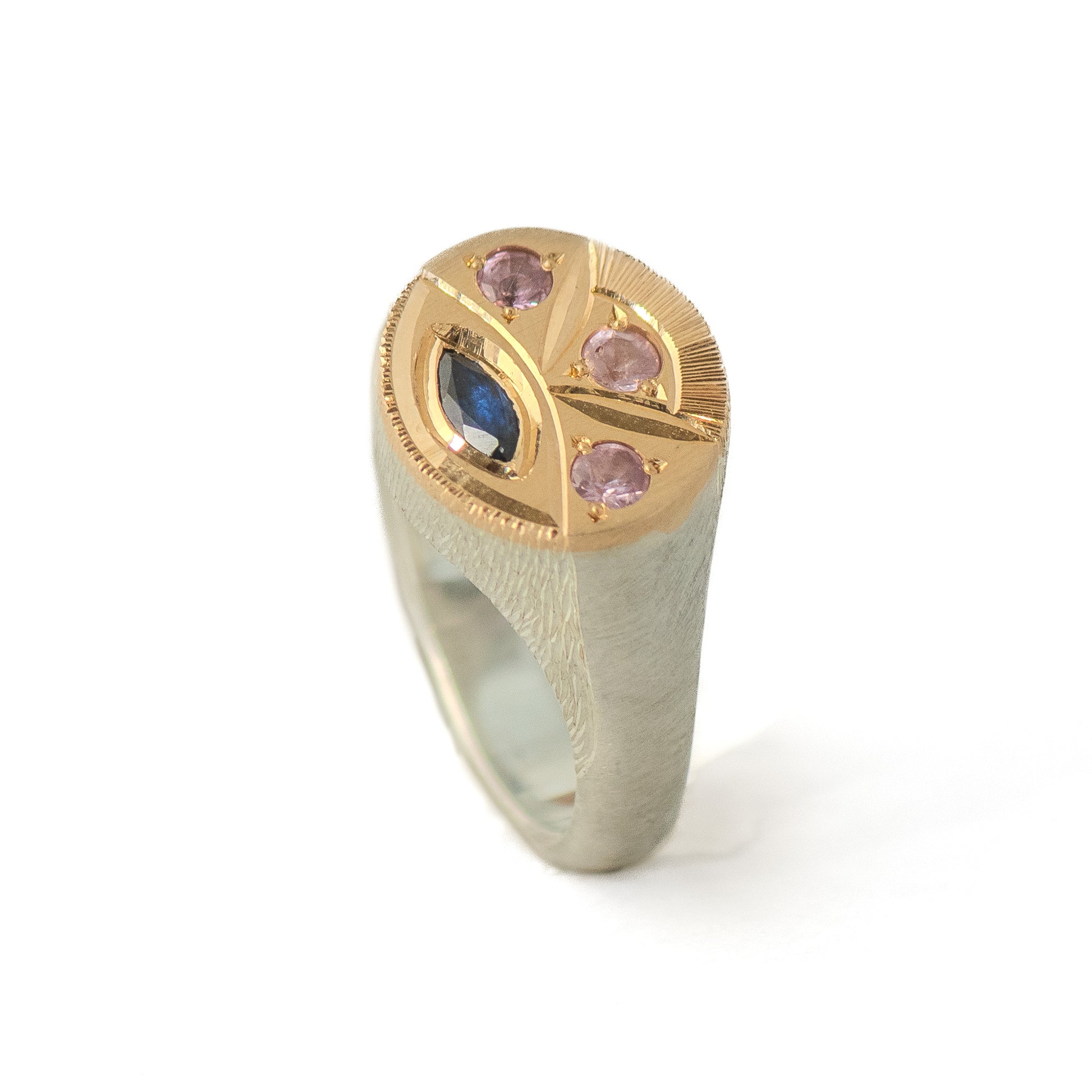 Crafted with a sterling silver base topped with 14k gold plate, this exclusive piece features pink and blue sapphires. Its intricate ornamental lines uniquely accentuate the stone placements, creating a distinctive and refined dance between lines, shapes textures and colors. As a unique creation, this "ONE of ONE" item is produced only once, ensuring no replicas will ever be made.