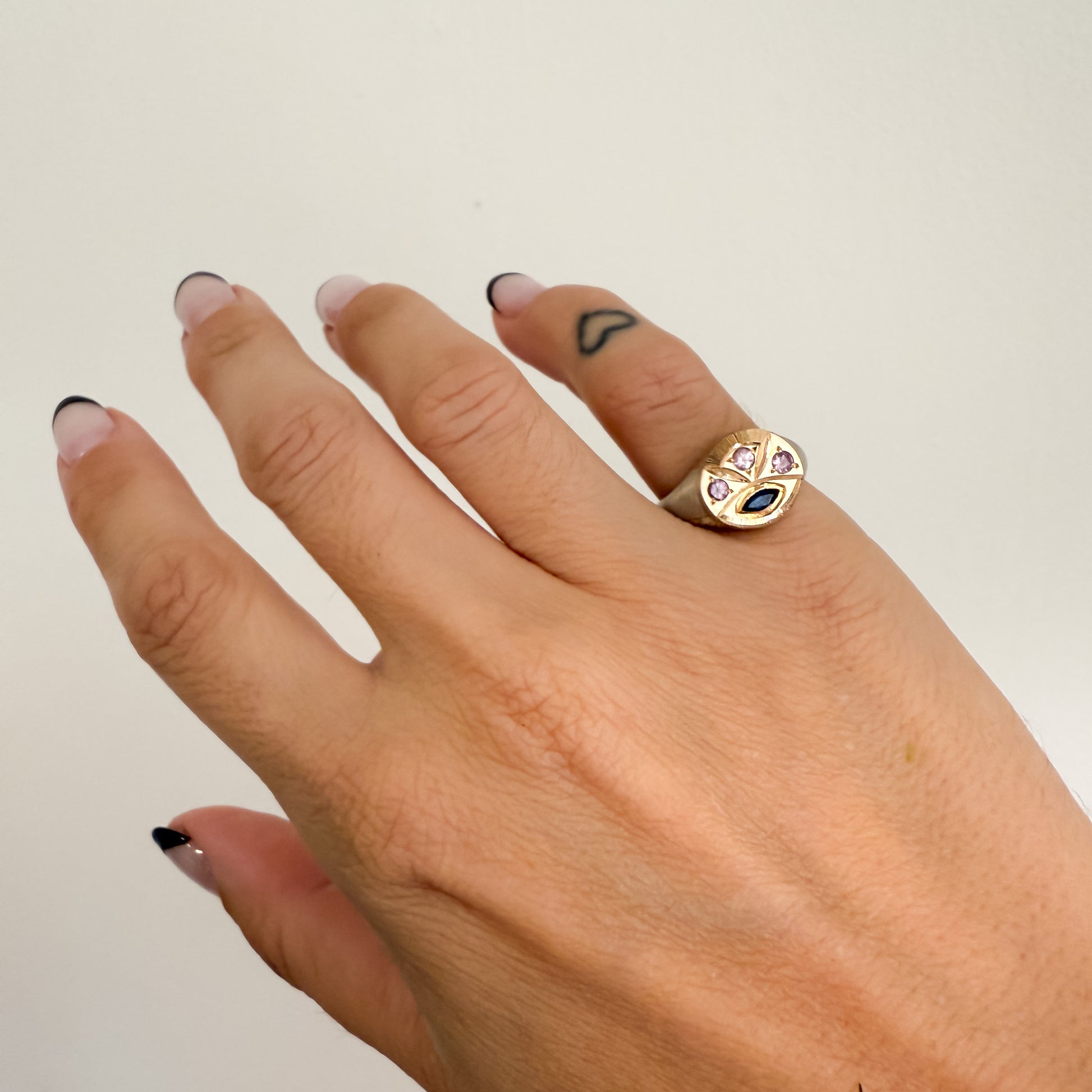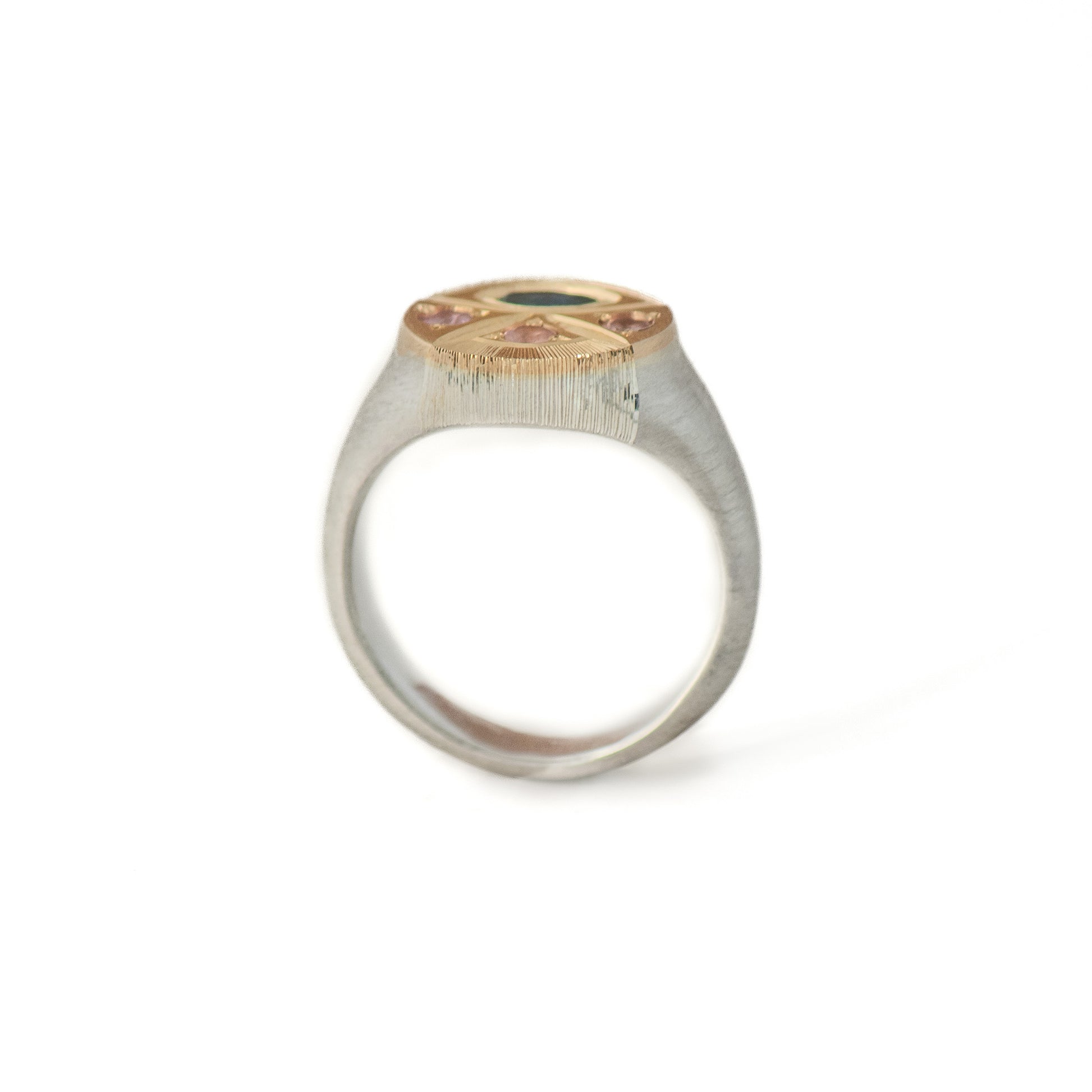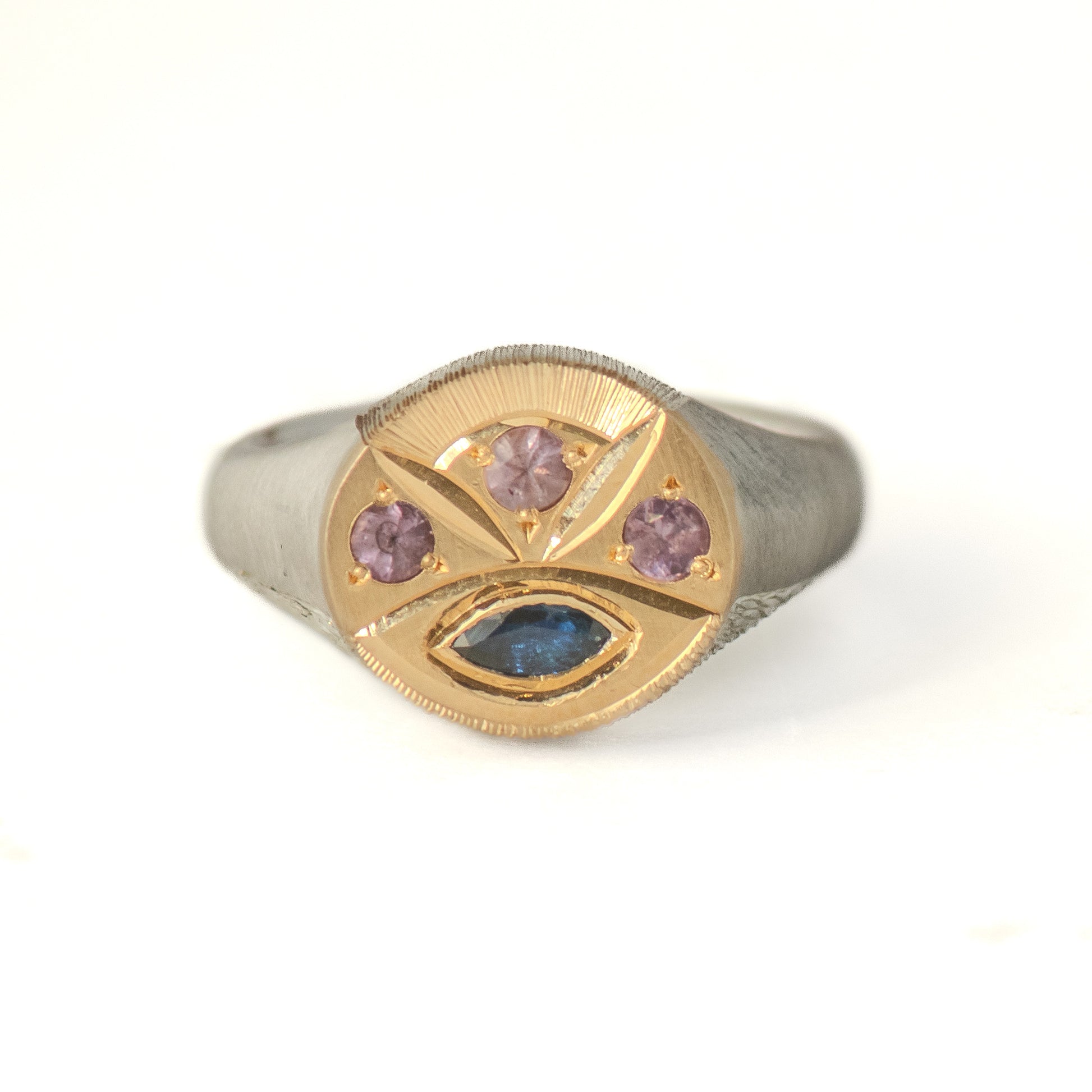 Crafted with a sterling silver base topped with 14k gold plate, this exclusive piece features pink and blue sapphires. Its intricate ornamental lines uniquely accentuate the stone placements, creating a distinctive and refined dance between lines, shapes textures and colors. As a unique creation, this "ONE of ONE" item is produced only once, ensuring no replicas will ever be made.