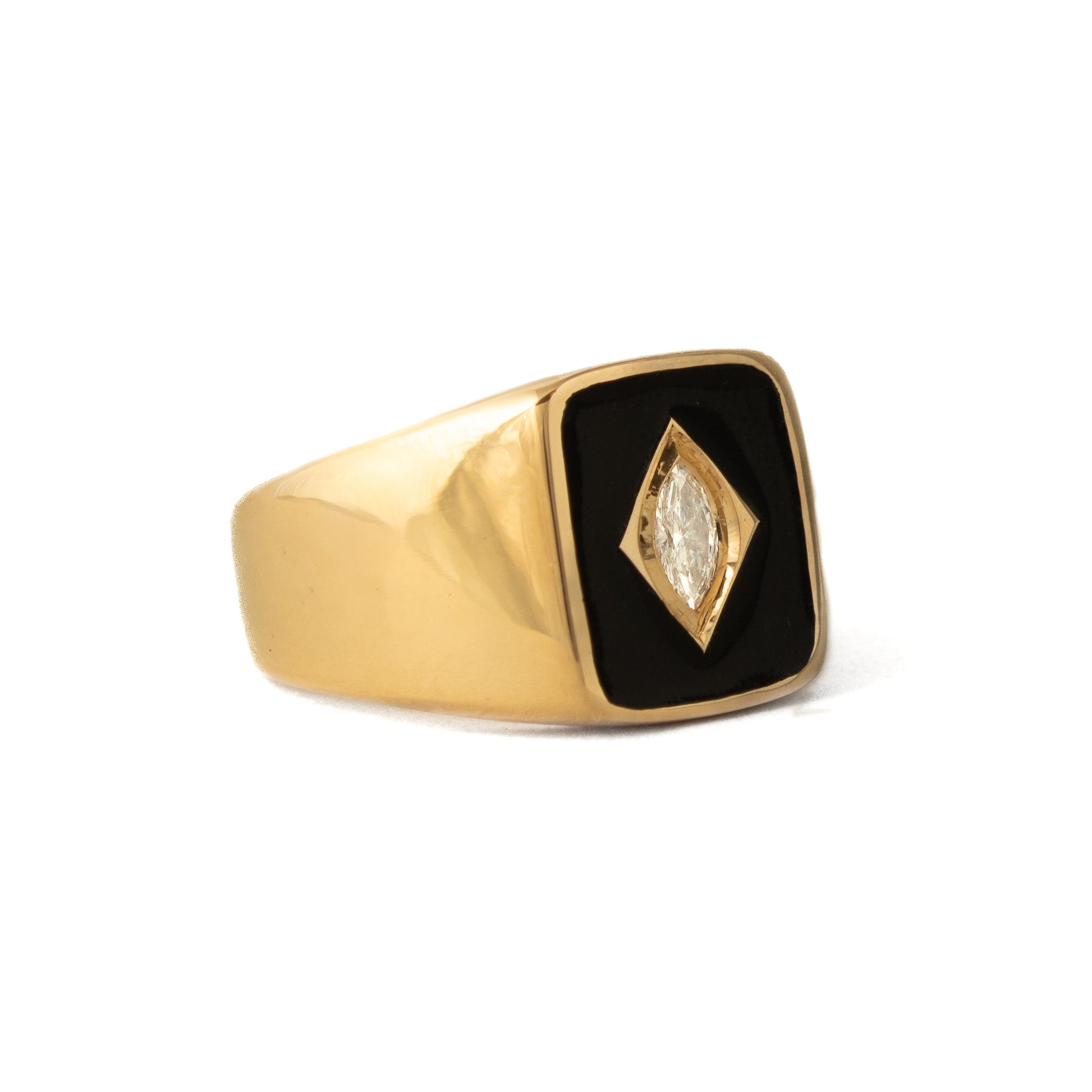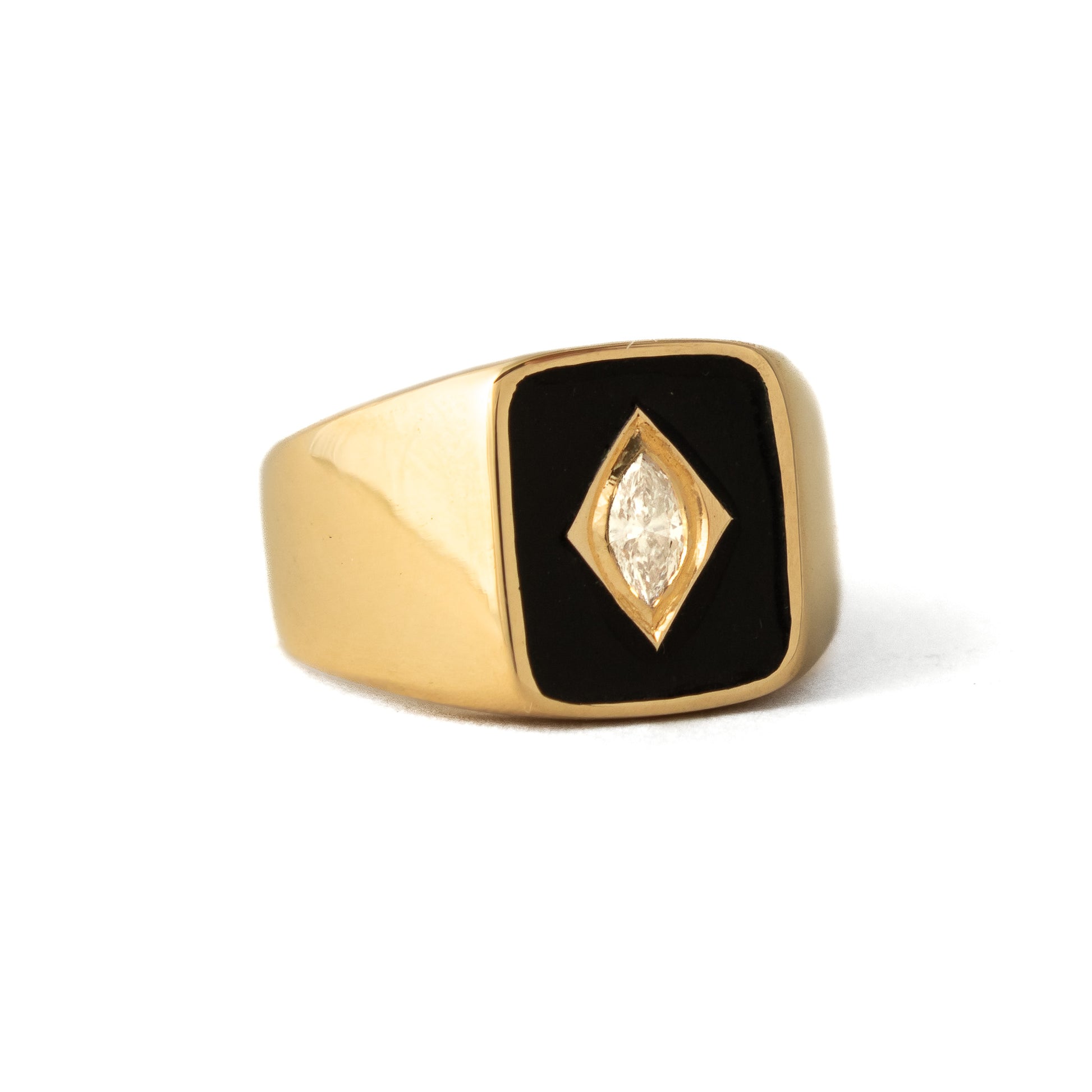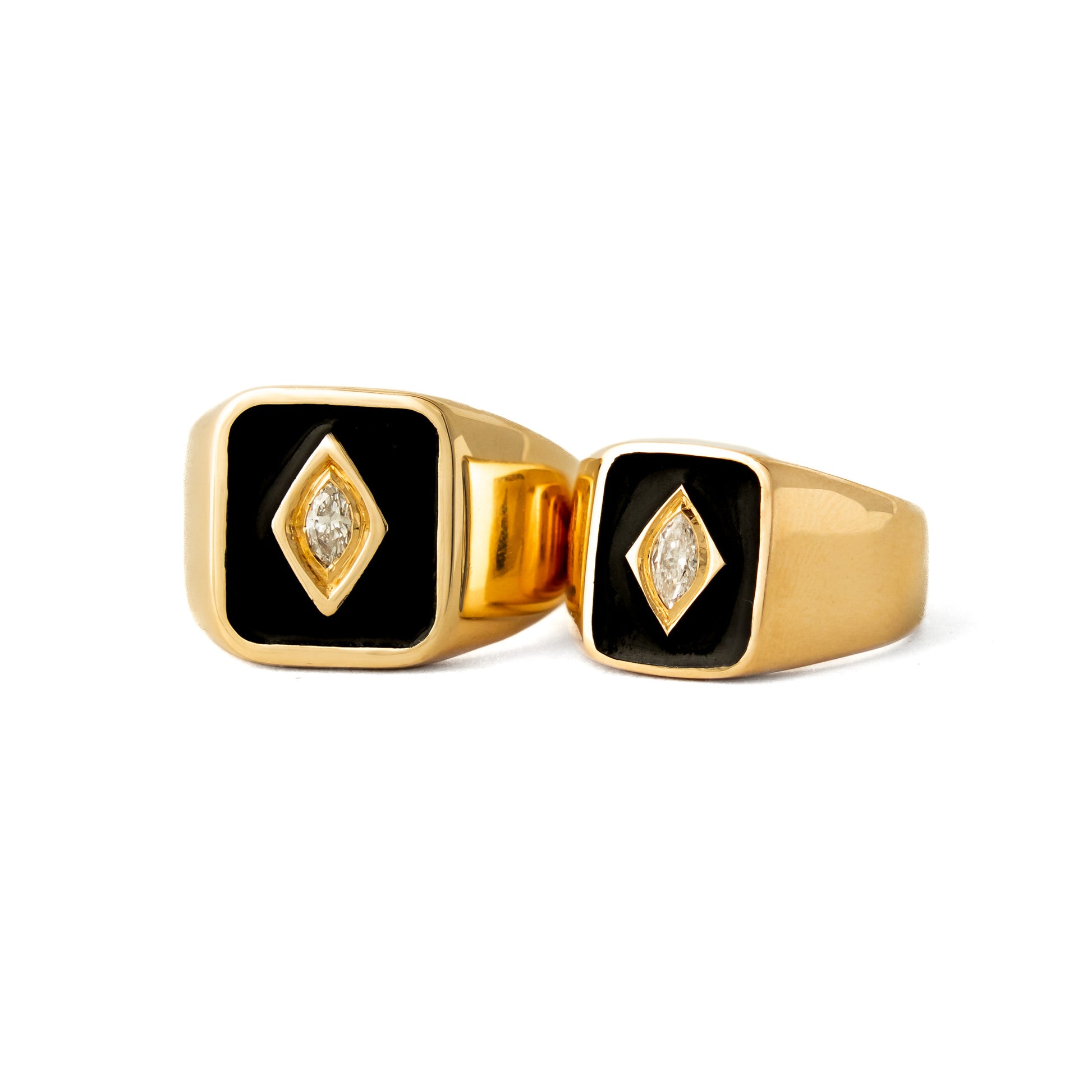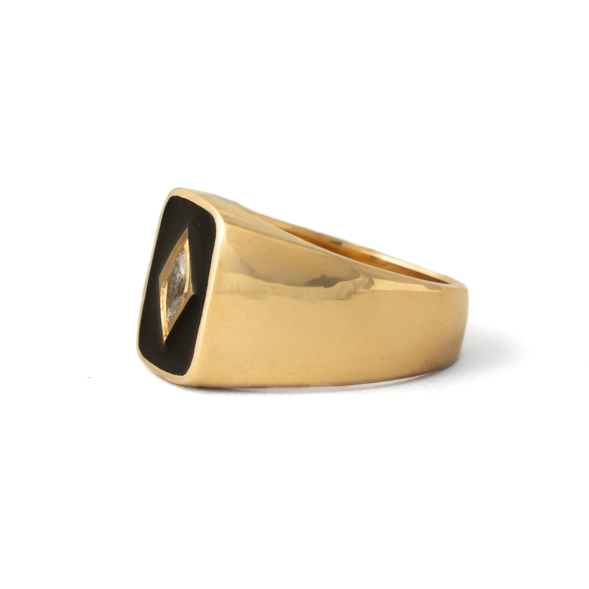12mmx10mm 14k solid yellow gold with black enamel on the face and a gold rhombus shape in the center with a marquise VS1 D white diamond 2.5mmx5mm flush set. This is one of our most classic shapes of the signet ring, vertical rectangular with rounded corners, bold and elegant will never go out of style. This is definitely not your trendy piece. Classy as F****. Makes a great wedding band as well.
