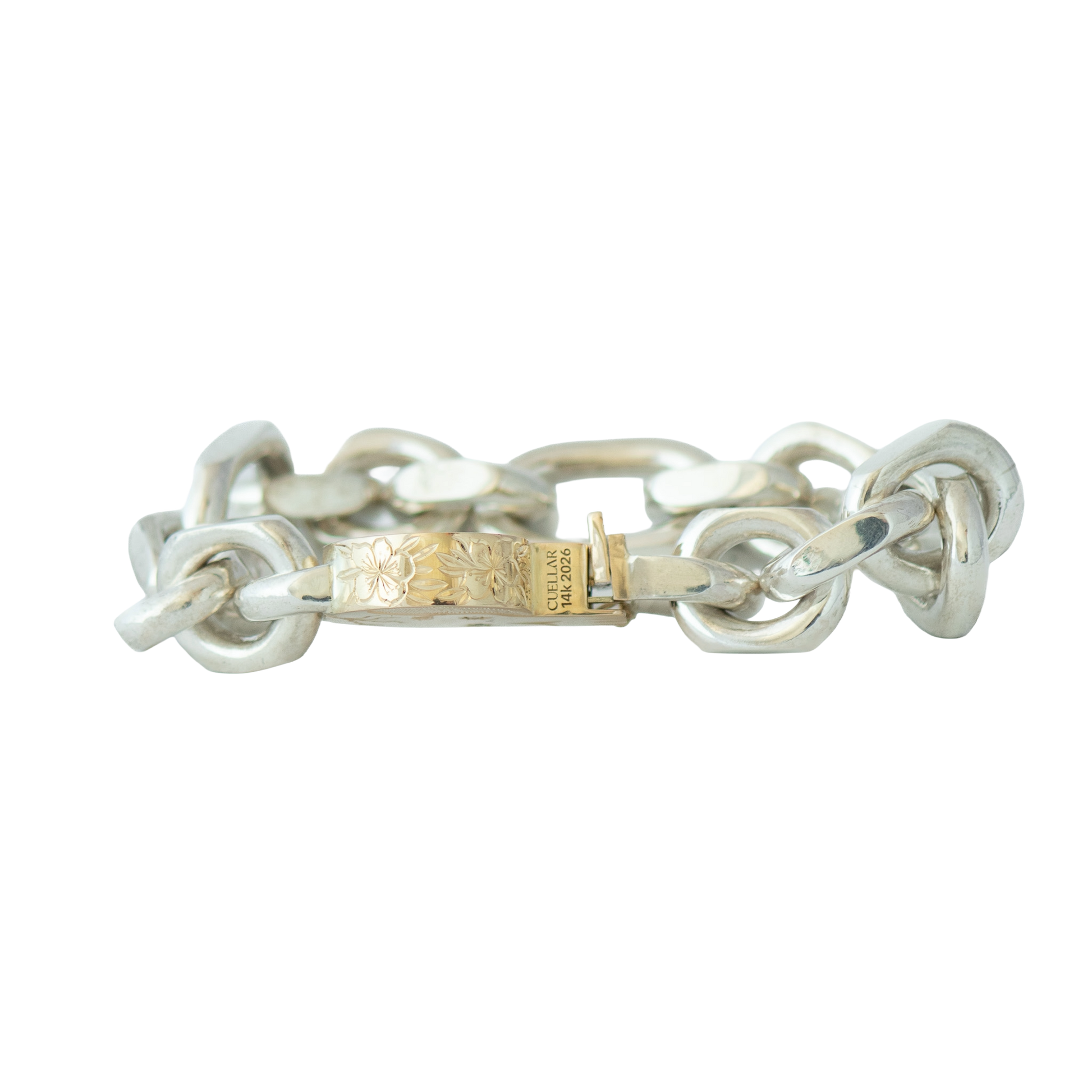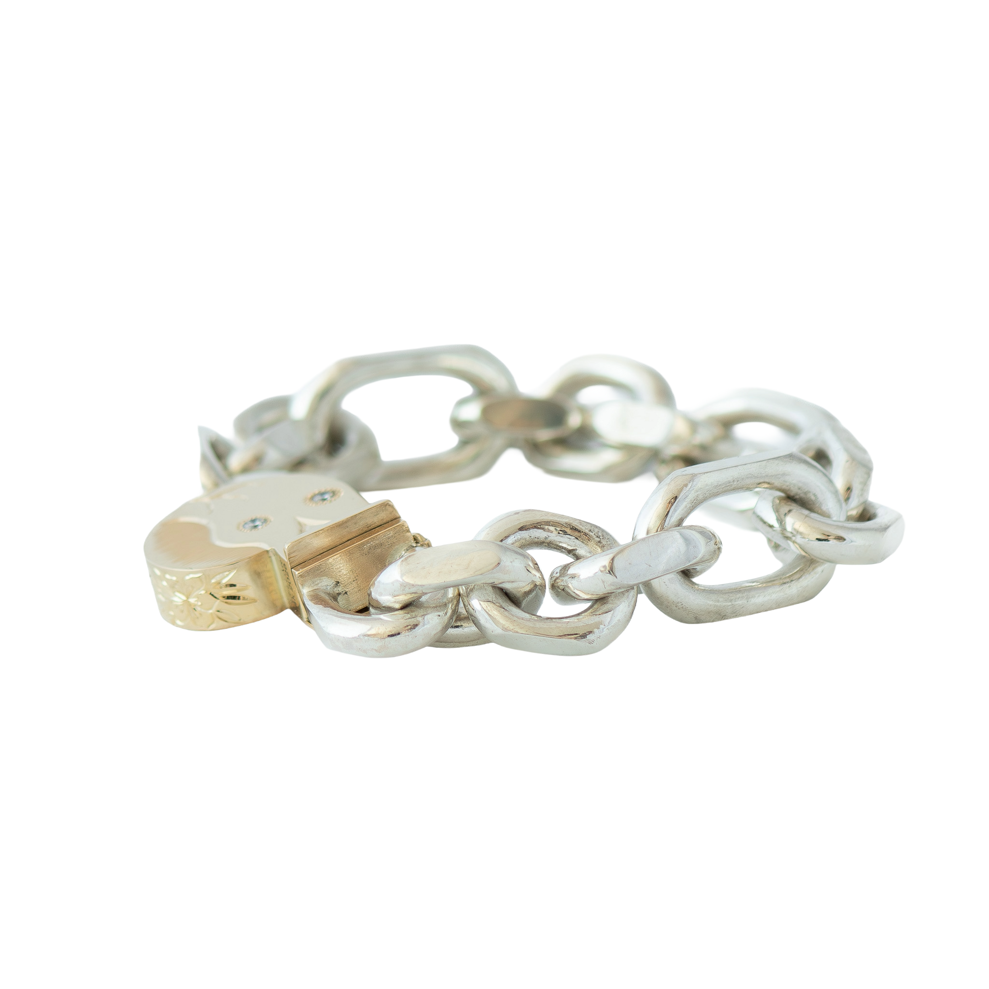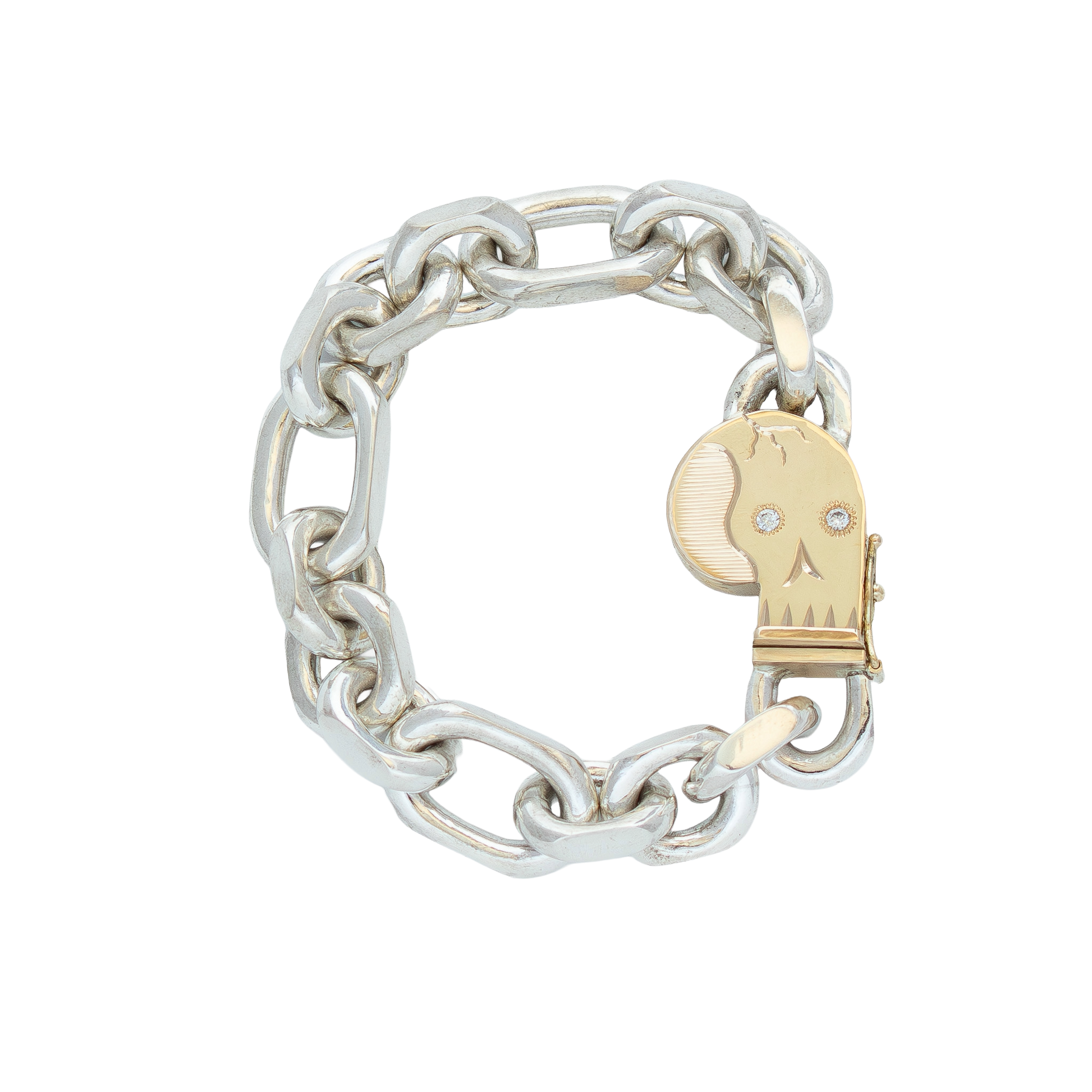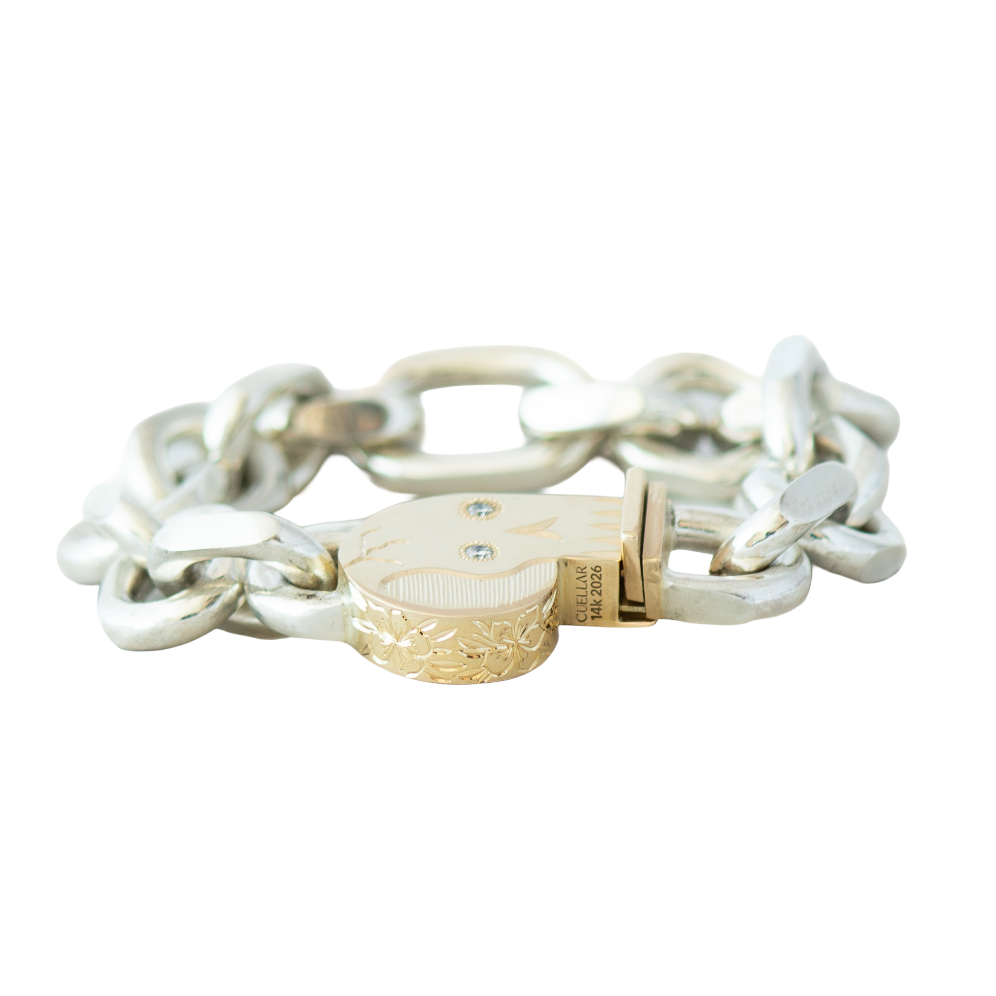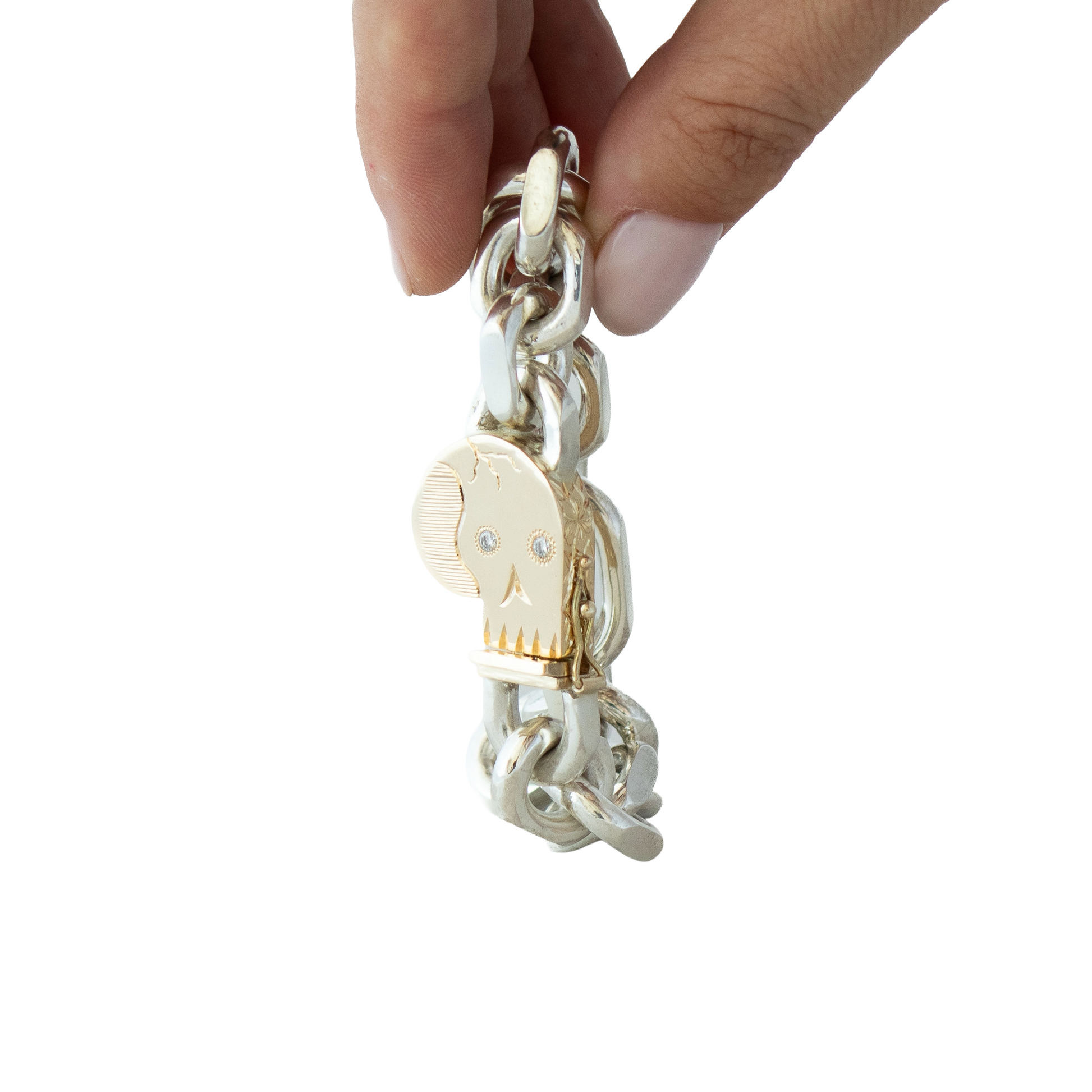 Heavy Weight Extra is a mixed metal bracelet that lives up to its name—substantial, bold, and unapologetically striking. This isn't jewelry for the faint of wrist. Entirely Handmade with sterling silver Figaro faceted links that catch light with every movement, paired with our signature 14k yellow gold SKULL clasp with white diamonds eyes on both sides, it's a masterpiece of contrasts. hand engraved, as always, with a subttle detail of flowers on the walls of the skull. This is the piece that turns heads, sparks conversations, and announces your arrival before you do. Wear it and own the room.