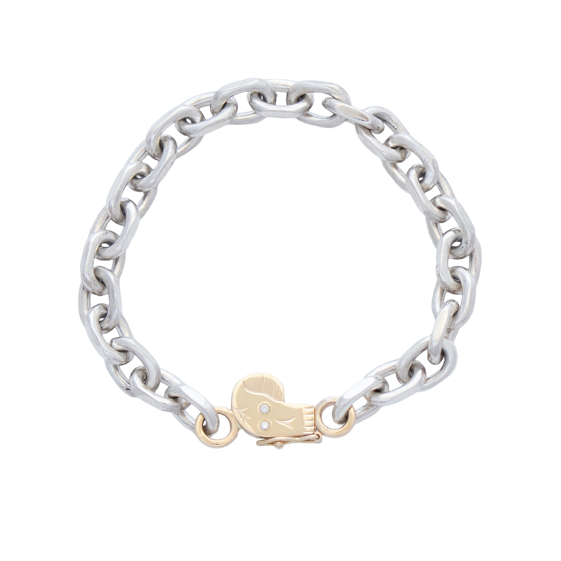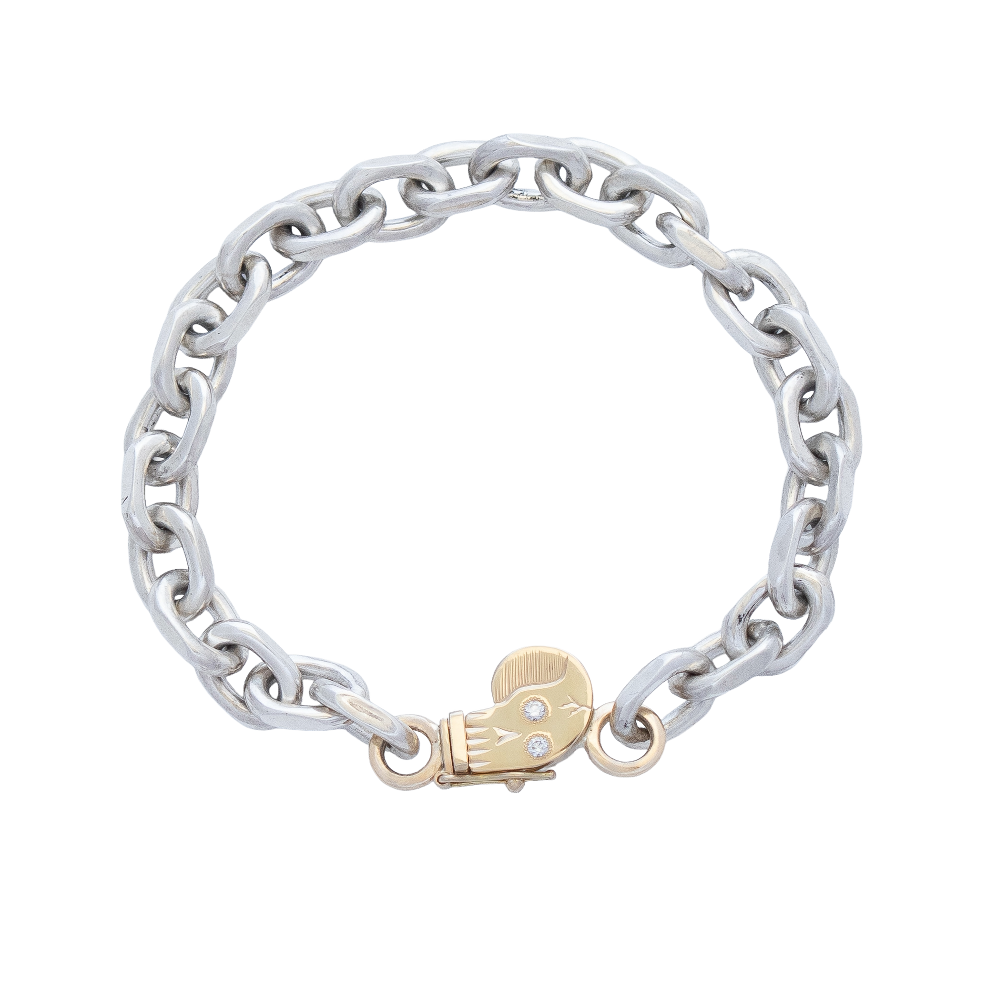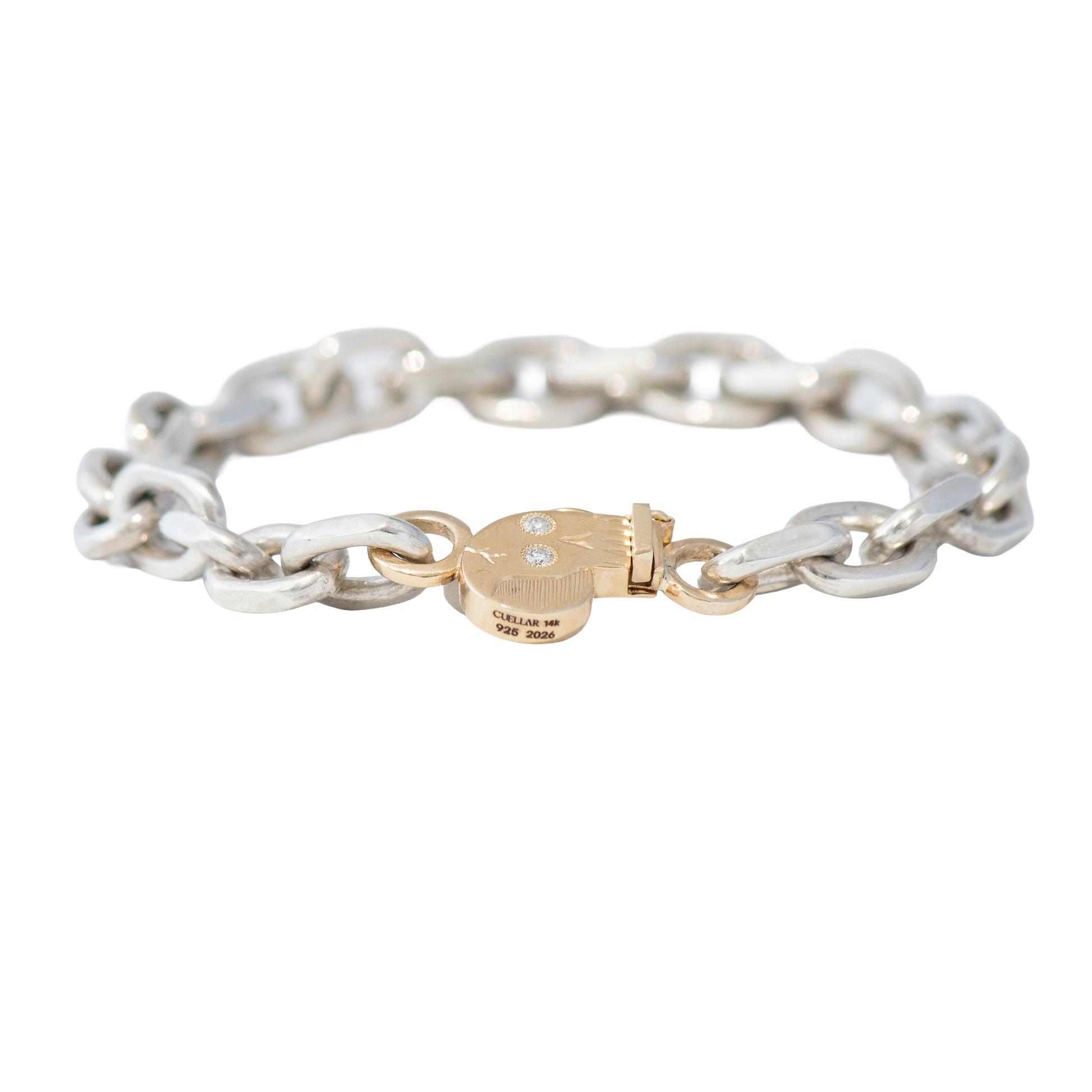 Heavy Weight is a mixed metal bracelet that lives up to its name—substantial, bold, and unapologetically striking. This isn't jewelry for the faint of wrist. Entirely handmade with sterling silver Cable faceted links that catch light with every movement, paired with our signature 14k yellow gold SKULL clasp, it's a masterpiece of contrasts. This is the piece that turns heads, sparks conversations, and announces your arrival before you do. Wear it and own the room.