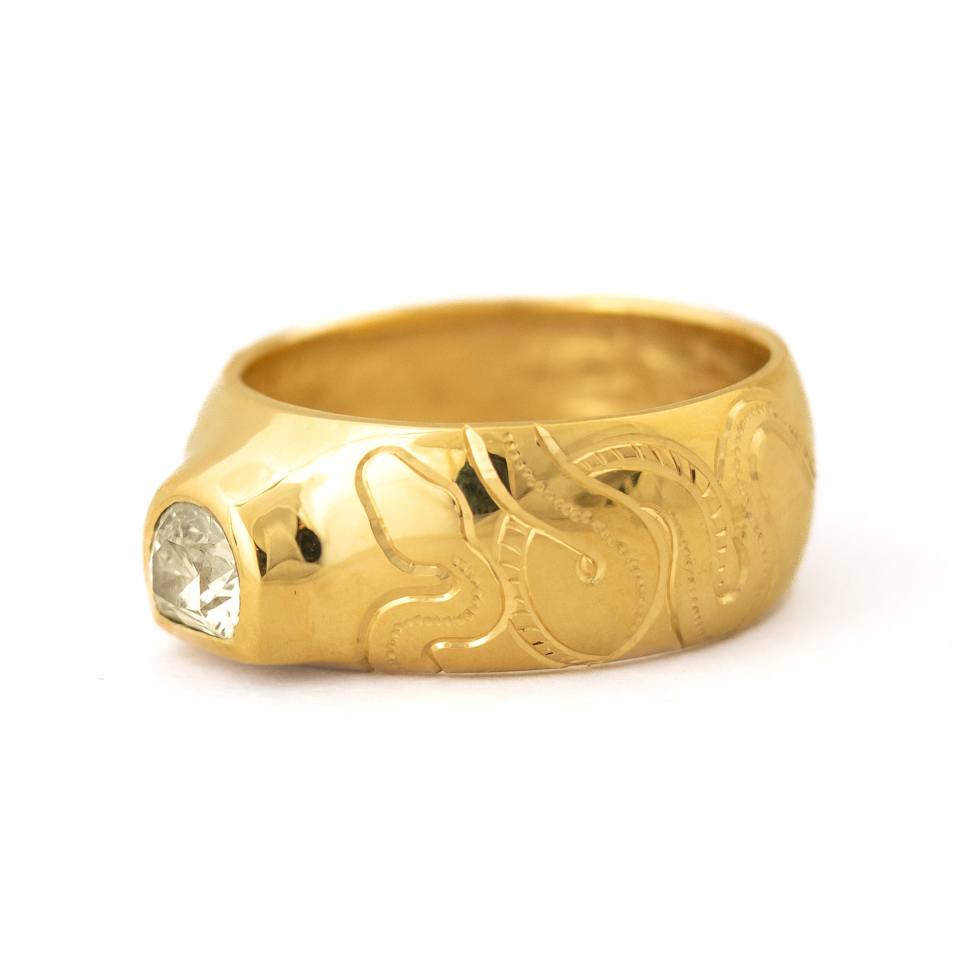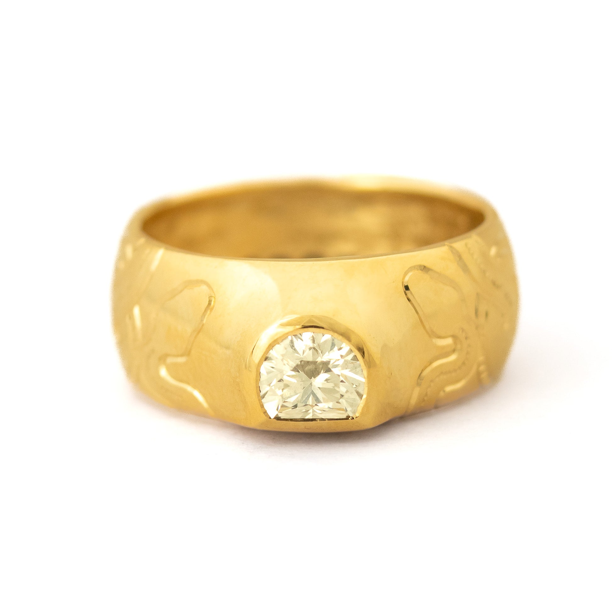 14k Yellow gold band paired with a one of a kind .42ct VS1-F "D" cut diamond bezel set on a 8.5mm width band. So sparkly you can't resist ! We would describe this ring as elegant with a touch of Rock'n'roll !