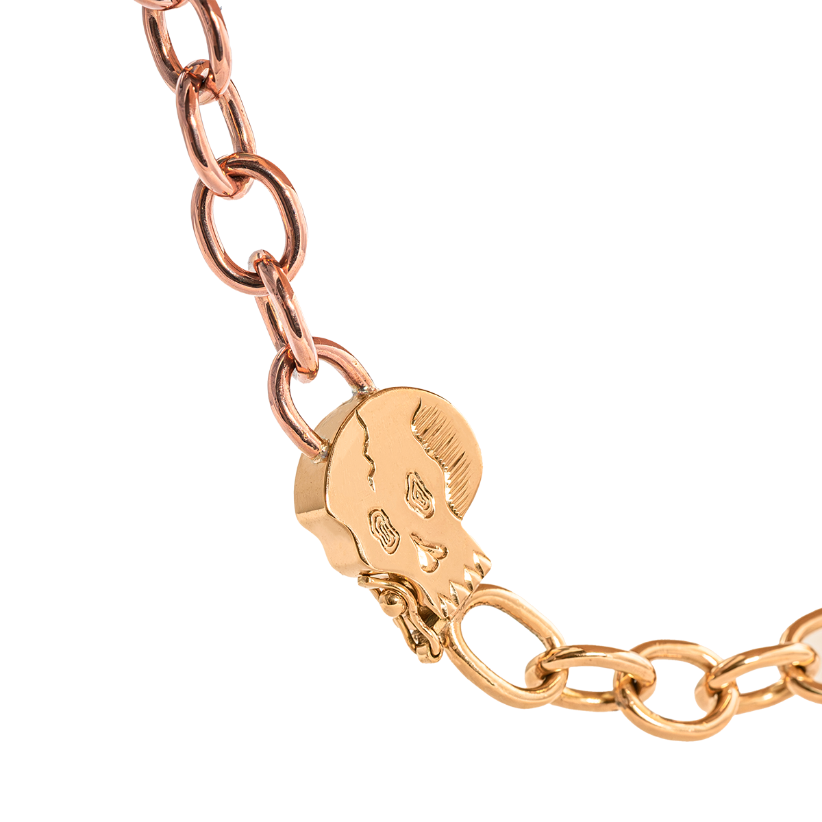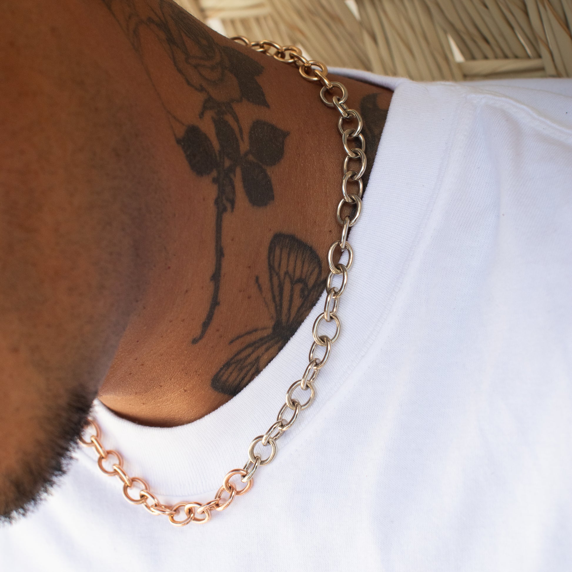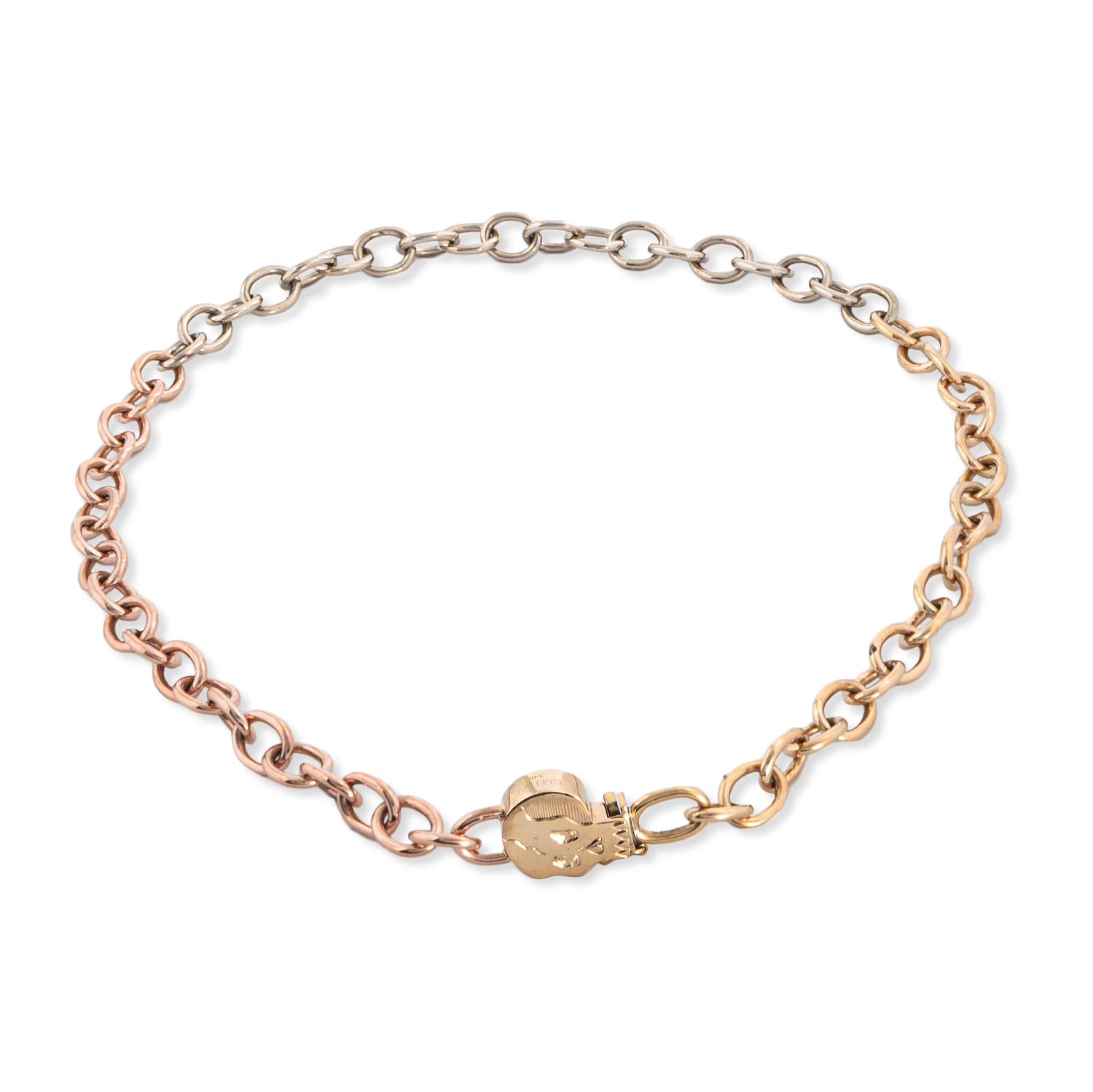 Tres Oros is a 8.5mm width chain made with 3 different classic solid 14k gold colors Rose, White and Yellow with oval links cable style and our original signature Skull Clasp that doubles as charm. No doubt your the one standing out.